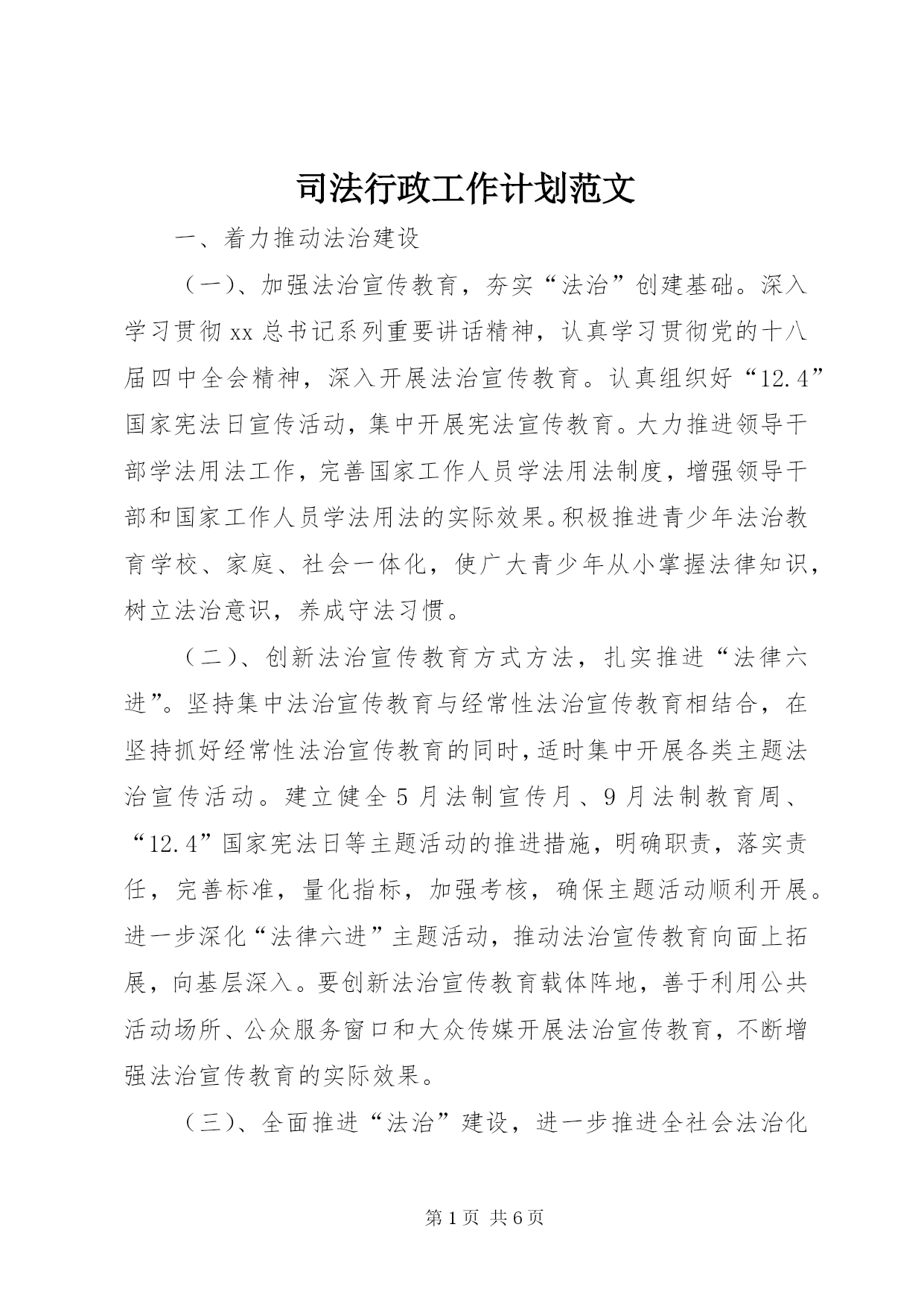 第PAGE\*Arabic\*MERGEFORMAT6页共NUMPAGES\*MERGEFORMAT6页司法行政工作计划范文一、着力推动法治建设(一)、加强法治宣传教育,夯实“法治”创建基础。深入学习贯彻xx总书记系列重要讲话精神,认真学习贯彻党的十八届四中全会精神,深入开展法治宣传教育。认真组织好“12.4”国家宪法日宣传活动,集中开展宪法宣传教育。大力推进领导干部学法用法工作,完善国家工作人员学法用法制度,增强领导干部和国家工作人员学法用法的实际效果。积极推进青少年法治教育学校、家庭、社会