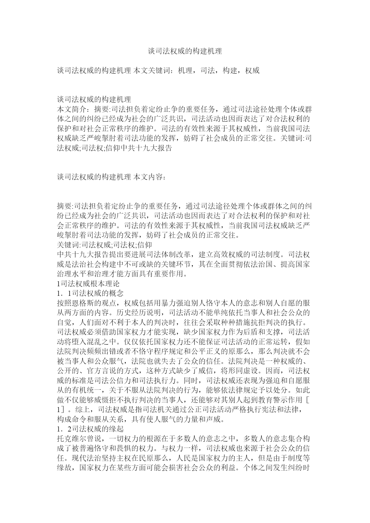 谈司法权威的构建机理谈司法权威的构建机理本文关键词:机理,司法,构建,权威谈司法权威的构建机理本文简介:摘要:司法担负着定纷止争的重要任务,通过司法途径处理个体或群体之间的纠纷已经成为社会的广泛共识,司法活动也因而表达了对合法权利的保护和对社会正常秩序的维护。司法的有效性来源于其权威性,当前我国司法权威缺乏严峻掣肘着司法功能的发挥,妨碍了社会成员的正常交往。关键词:司法权威;司法权;信仰中共十九大报告谈司法权威的构建机理本文内容:摘要:司法担负着定纷止争的重要任务,通过司法途径处理个体或群体之间的纠纷已经