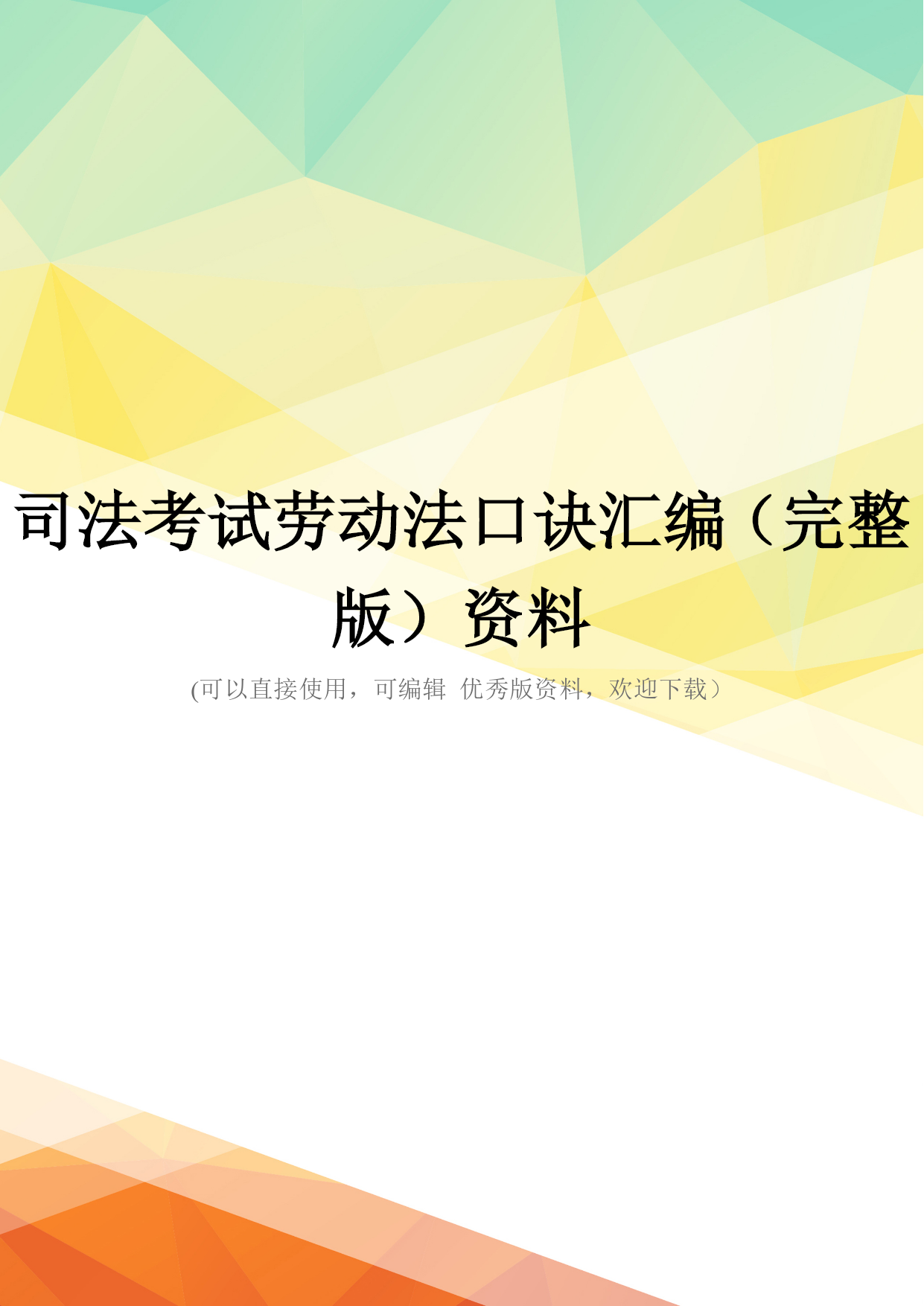 司法考试劳动法口诀汇编(完整版)资料(可以直接使用,可编辑优秀版资料,欢迎下载)司法考试劳动法口诀一、劳动争议范围口诀:黎明初她夫沛公先护此驴退表面意思:天刚亮时她丈夫沛公先保护这头驴撤退对应法条黎:即离,离职纠纷公:即工,工资纠纷明:即名,除名纠纷先:即险,保险纠纷初:即除,开除纠纷护:劳动保护纠纷她:其他情形此:即辞,辞职纠纷夫:即福,福利纠纷驴:即履,劳动合同履行纠纷沛:即赔,赔偿纠纷退:辞退纠纷二、不适用《劳动法》的主体口诀:叫工农军保飞禽对应法条叫:即交,有外交特权和豁免权的外国人工:即公,公务