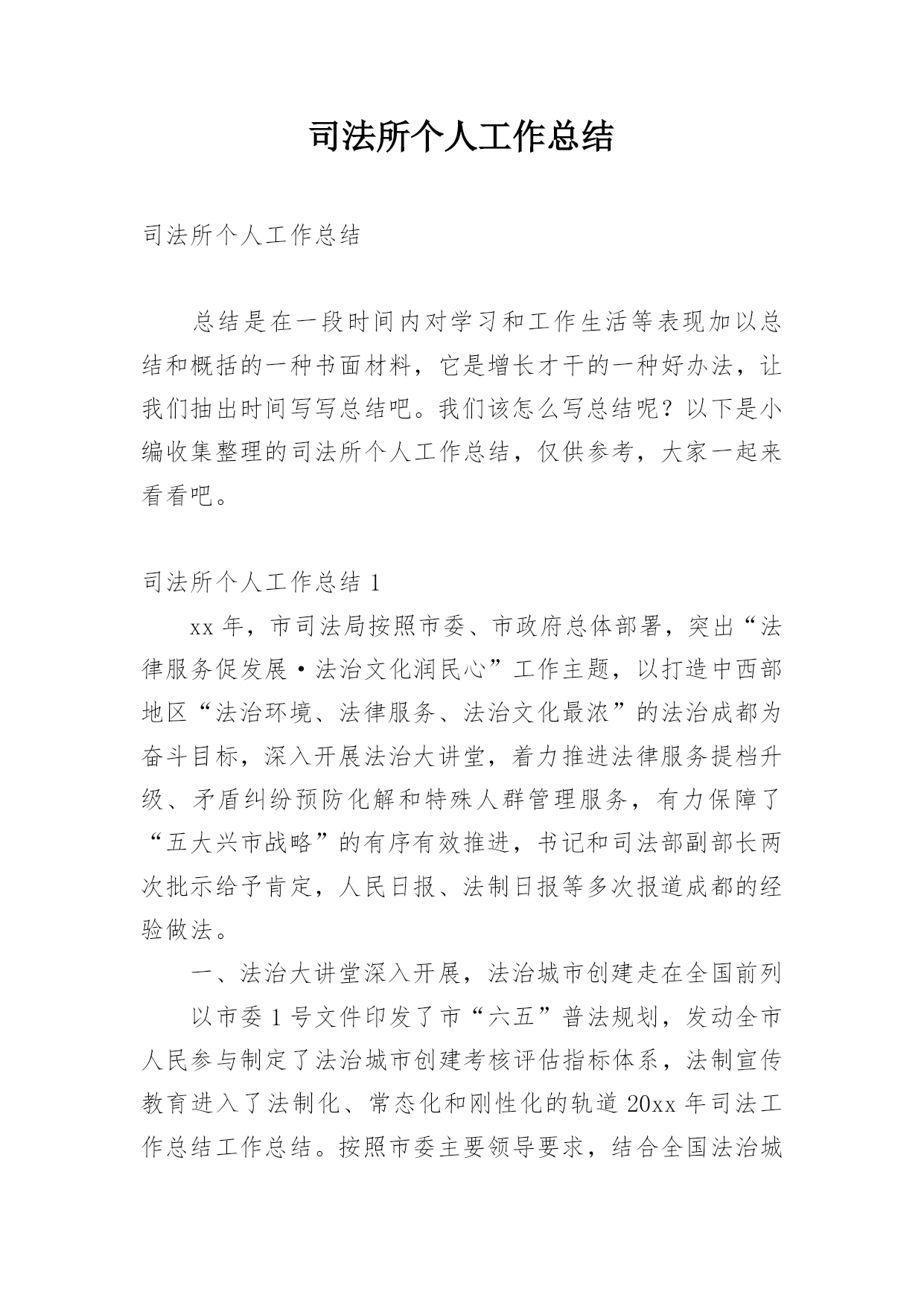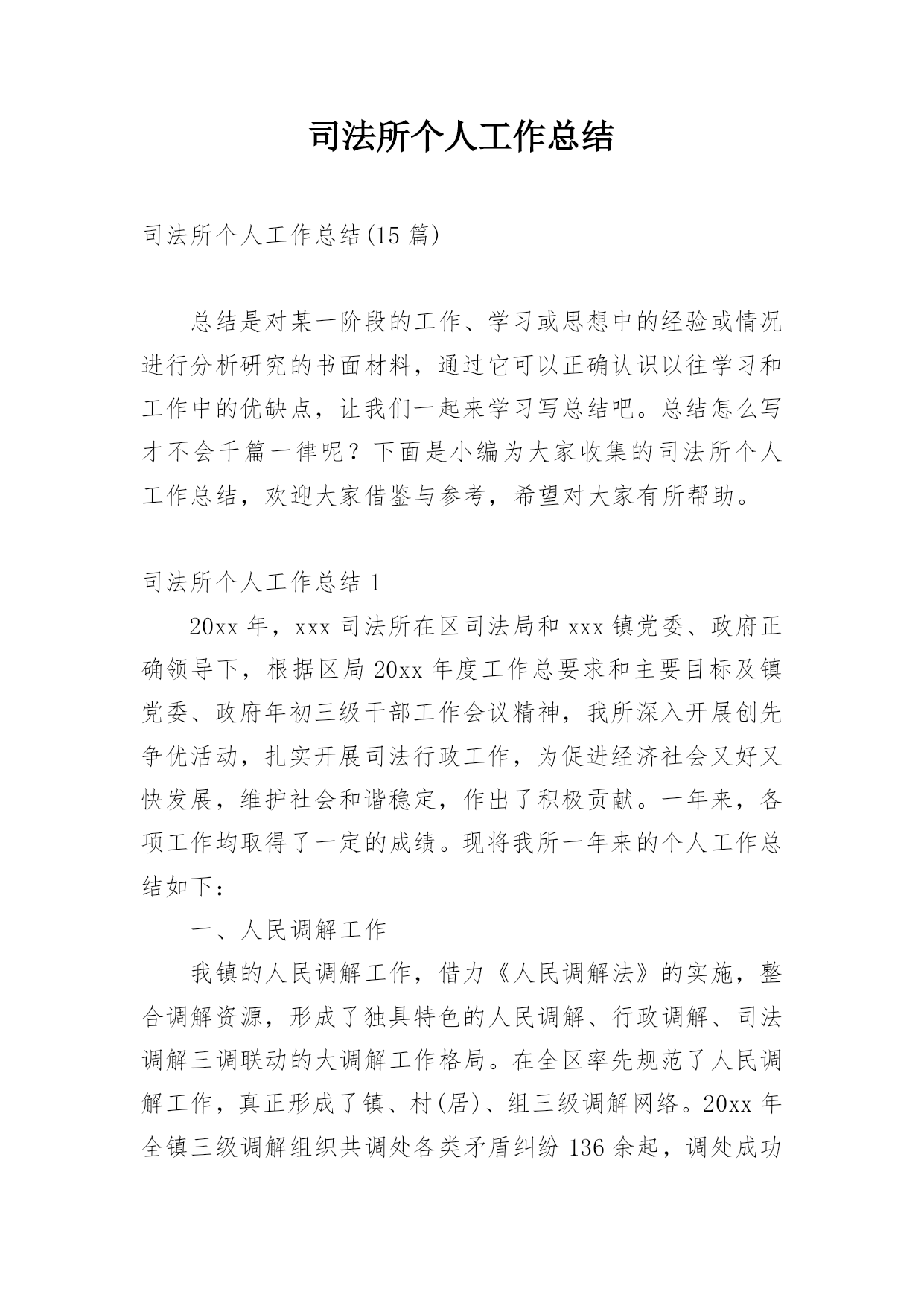 司法所个人工作总结司法所个人工作总结(15篇)总结是对某一阶段的工作、学习或思想中的经验或情况进行分析研究的书面材料,通过它可以正确认识以往学习和工作中的优缺点,让我们一起来学习写总结吧。总结怎么写才不会千篇一律呢?下面是小编为大家收集的司法所个人工作总结,欢迎大家借鉴与参考,希望对大家有所帮助。司法所个人工作总结120xx年,xxx司法所在区司法局和xxx镇党委、政府正确领导下,根据区局20xx年度工作总要求和主要目标及镇党委、政府年初三级干部工作会议精神,我所深入开展创先争优活动,扎实开展司法行政工作