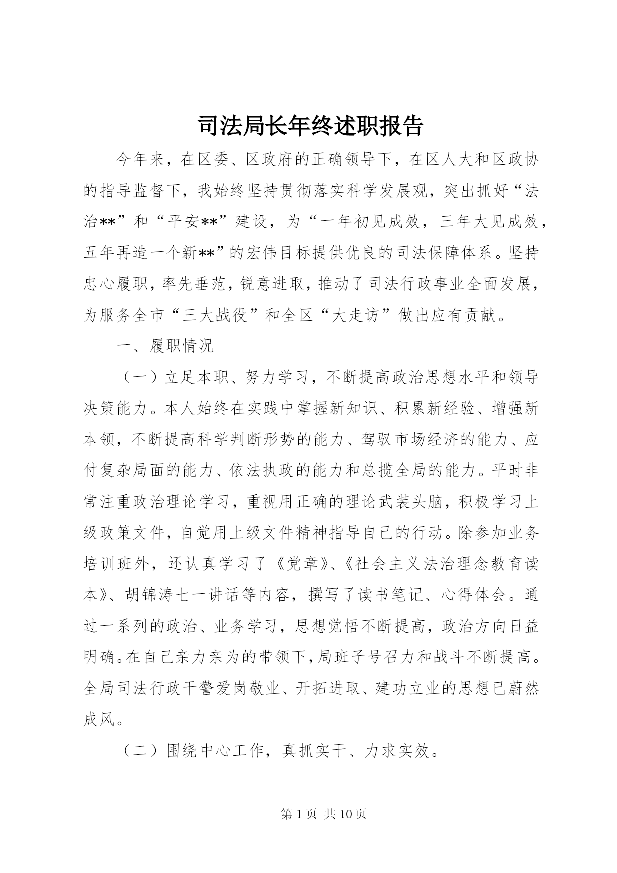 第PAGE\*Arabic\*MERGEFORMAT10页共NUMPAGES\*MERGEFORMAT10页司法局长年终述职报告今年来,在区委、区政府的正确领导下,在区人大和区政协的指导监督下,我始终坚持贯彻落实科学发展观,突出抓好“法治**”和“平安**”建设,为“一年初见成效,三年大见成效,五年再造一个新**”的宏伟目标提供优良的司法保障体系。坚持忠心履职,率先垂范,锐意进取,推动了司法行政事业全面发展,为服务全市“三大战役”和全区“大走访”做出应有贡献。一、履职情况(一)立足本职、努力学