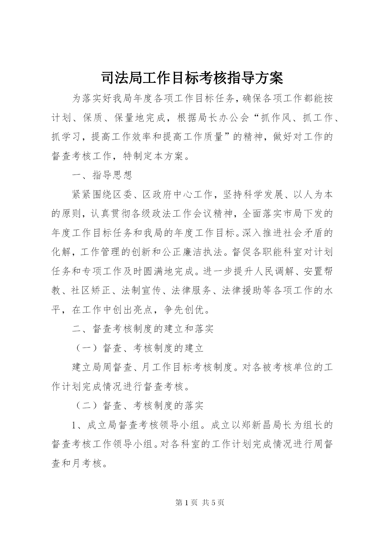 第PAGE\*Arabic\*MERGEFORMAT5页共NUMPAGES\*MERGEFORMAT5页司法局工作目标考核指导方案为落实好我局年度各项工作目标任务,确保各项工作都能按计划、保质、保量地完成,根据局长办公会“抓作风、抓工作、抓学习,提高工作效率和提高工作质量”的精神,做好对工作的督查考核工作,特制定本方案。一、指导思想紧紧围绕区委、区政府中心工作,坚持科学发展、以人为本的原则,认真贯彻各级政法工作会议精神,全面落实市局下发的年度工作目标任务和我局的年度工作目标。深入推进社会矛盾的