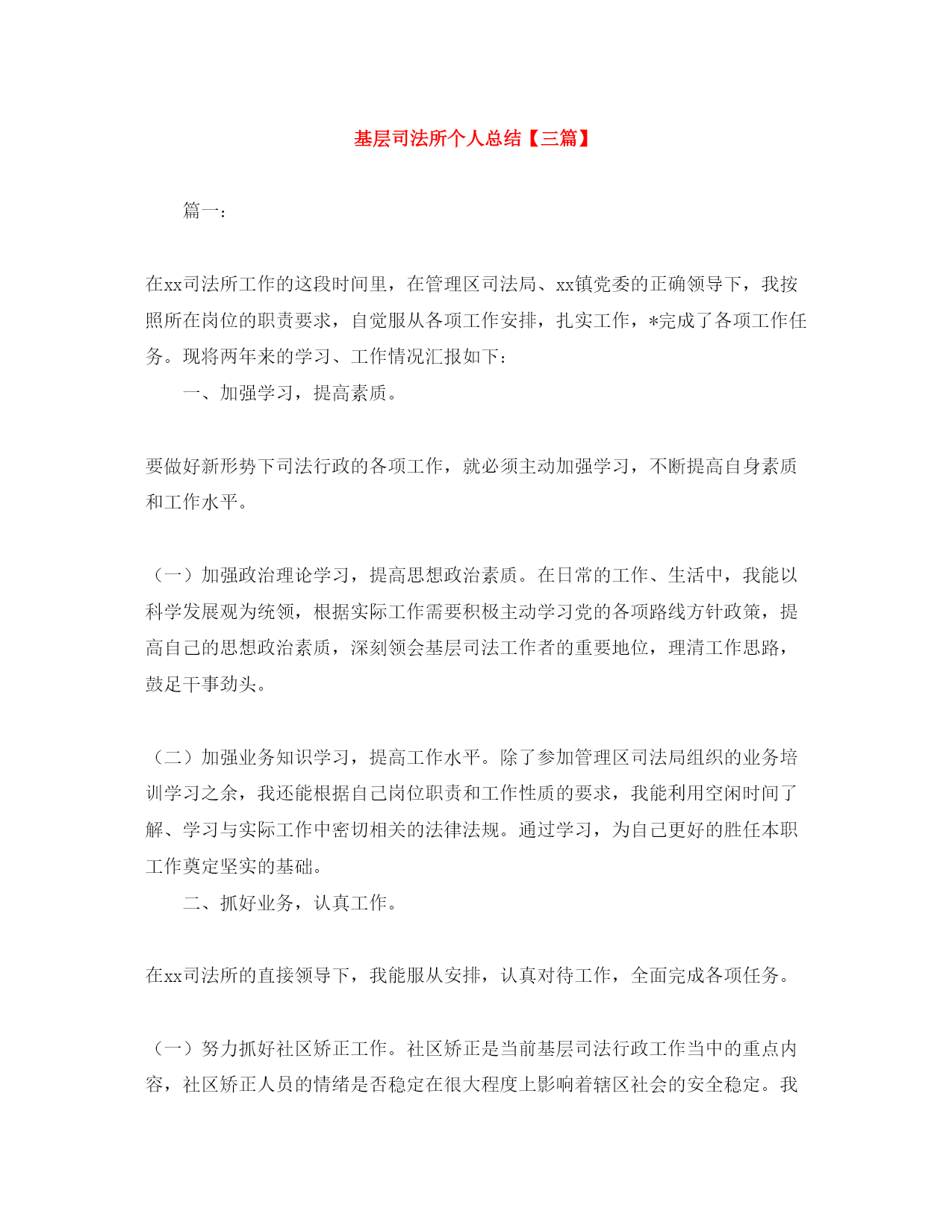 此资料由网络收集而来,如有侵权请告知上传者立即删除。资料共分享,我们负责传递知识。基层司法所个人总结【三篇】篇一:在xx司法所工作的这段时间里,在管理区司法局、xx镇党委的正确领导下,我按照所在岗位的职责要求,自觉服从各项工作安排,扎实工作,*完成了各项工作任务。现将两年来的学习、工作情况汇报如下:一、加强学习,提高素质。要做好新形势下司法行政的各项工作,就必须主动加强学习,不断提高自身素质和工作水平。(一)加强政治理论学习,提高思想政治素质。在日常的工作、生活中,我能以科学发展观为统领,根据实际工作需要