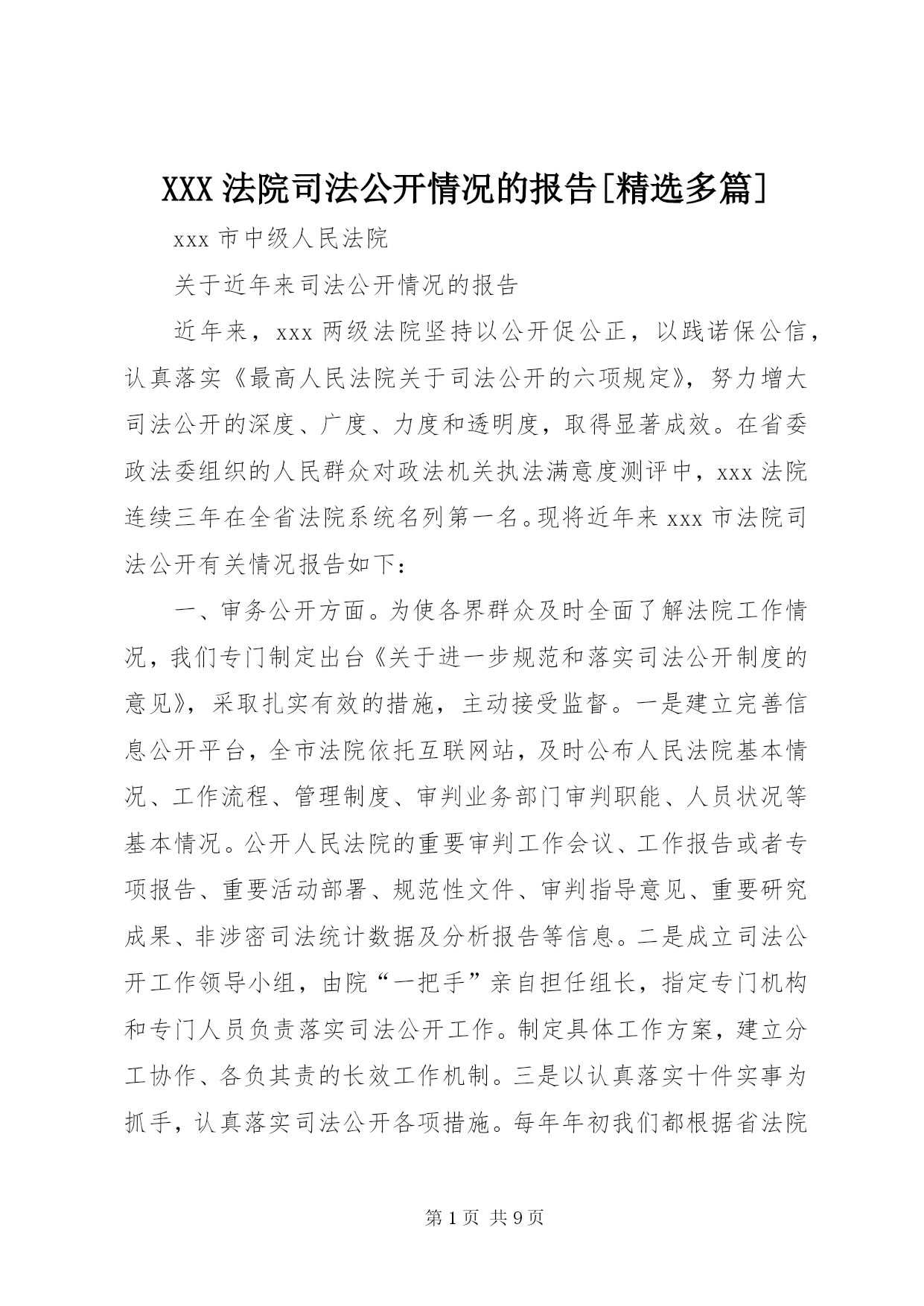 第PAGE\*Arabic\*MERGEFORMAT9页共NUMPAGES\*MERGEFORMAT9页XXX法院司法公开情况的报告[精选多篇]xxx市中级人民法院关于近年来司法公开情况的报告近年来,xxx两级法院坚持以公开促公正,以践诺保公信,认真落实《最高人民法院关于司法公开的六项规定》,努力增大司法公开的深度、广度、力度和透明度,取得显著成效。在省委政法委组织的人民群众对政法机关执法满意度测评中,xxx法院连续三年在全省法院系统名列第一名。现将近年来xxx市法院司法公开有关情况报告如下:
