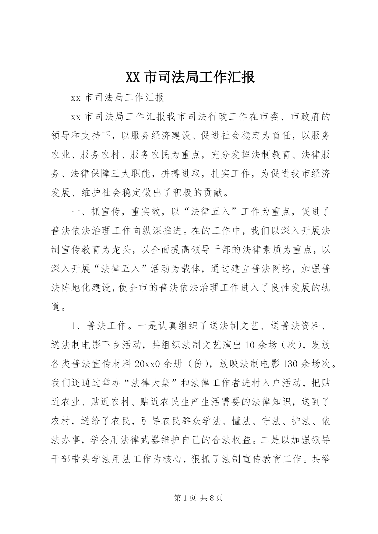 第PAGE\*Arabic\*MERGEFORMAT4页共NUMPAGES\*MERGEFORMAT4页XX市司法局工作汇报xx市司法局工作汇报我市司法行政工作在市委、市政府的领导和支持下,以服务经济建设、促进社会稳定为首任,以服务农业、服务农村、服务农民为重点,充分发挥法制教育、法律服务、法律保障三大职能,拼搏进取,扎实工作,为促进我市经济发展、维护社会稳定做出了积极的贡献。一、抓宣传,重实效,以“法律五入”工作为重点,促进了普法依法治理工作向纵深推进。在的工作中,我们以深入开展法制宣传教育