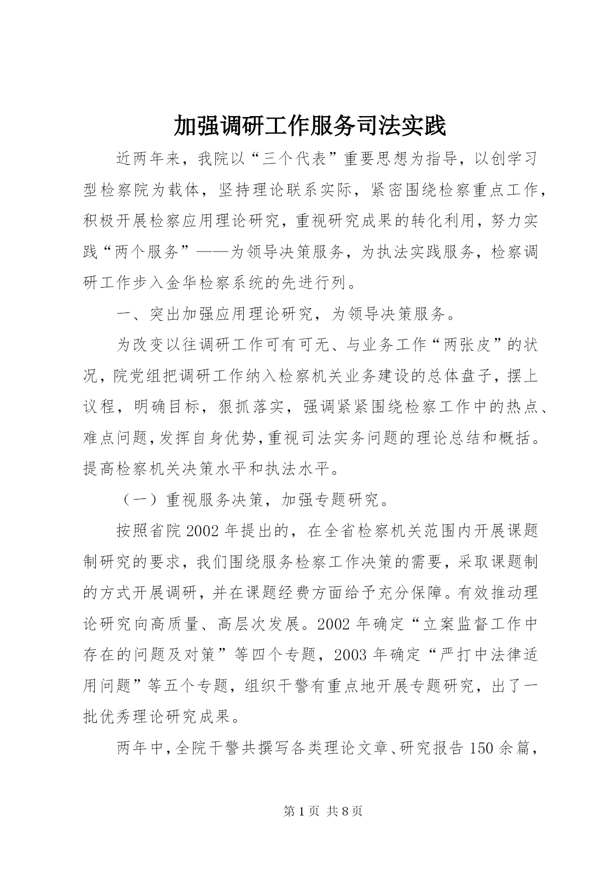 第PAGE\*Arabic\*MERGEFORMAT8页共NUMPAGES\*MERGEFORMAT8页加强调研工作服务司法实践近两年来,我院以“三个代表”重要思想为指导,以创学习型检察院为载体,坚持理论联系实际,紧密围绕检察重点工作,积极开展检察应用理论研究,重视研究成果的转化利用,努力实践“两个服务”——为领导决策服务,为执法实践服务,检察调研工作步入金华检察系统的先进行列。一、突出加强应用理论研究,为领导决策服务。为改变以往调研工作可有可无、与业务工作“两张皮”的状况,院党组把调研工作纳
