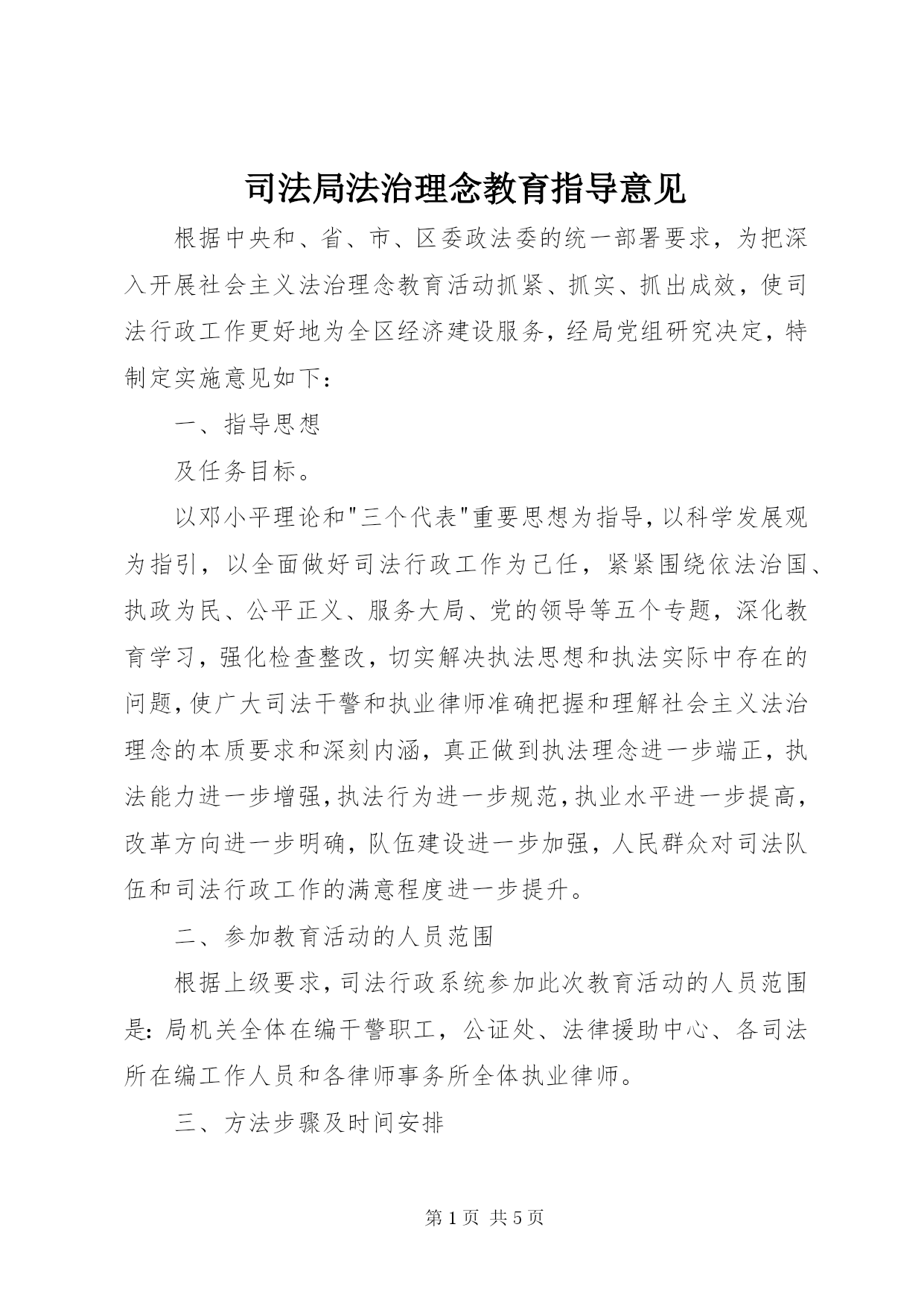 第PAGE\*Arabic\*MERGEFORMAT5页共NUMPAGES\*MERGEFORMAT5页司法局法治理念教育指导意见根据中央和、省、市、区委政法委的统一部署要求,为把深入开展社会主义法治理念教育活动抓紧、抓实、抓出成效,使司法行政工作更好地为全区经济建设服务,经局党组研究决定,特制定实施意见如下:一、指导思想及任务目标。以邓小平理论和"三个代表"重要思想为指导,以科学发展观为指引,以全面做好司法行政工作为己任,紧紧围绕依法治国、执政为民、公平正义、服务大局、党的领导等五个专题,深