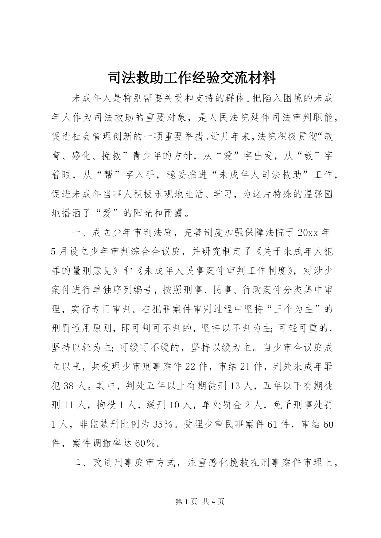 第PAGE\*Arabic\*MERGEFORMAT4页共NUMPAGES\*MERGEFORMAT4页司法救助工作经验交流材料未成年人是特别需要关爱和支持的群体。把陷入困境的未成年人作为司法救助的重要对象,是人民法院延伸司法审判职能,促进社会管理创新的一项重要举措。近几年来,法院积极贯彻“教育、感化、挽救”青少年的方针,从“爱”字出发,从“教”字着眼,从“帮”字入手,稳妥推进“未成年人司法救助”工作,促进未成年当事人积极乐观地生活、学习,为这片特殊的温馨园地播洒了“爱”的阳光和雨露。一、成立