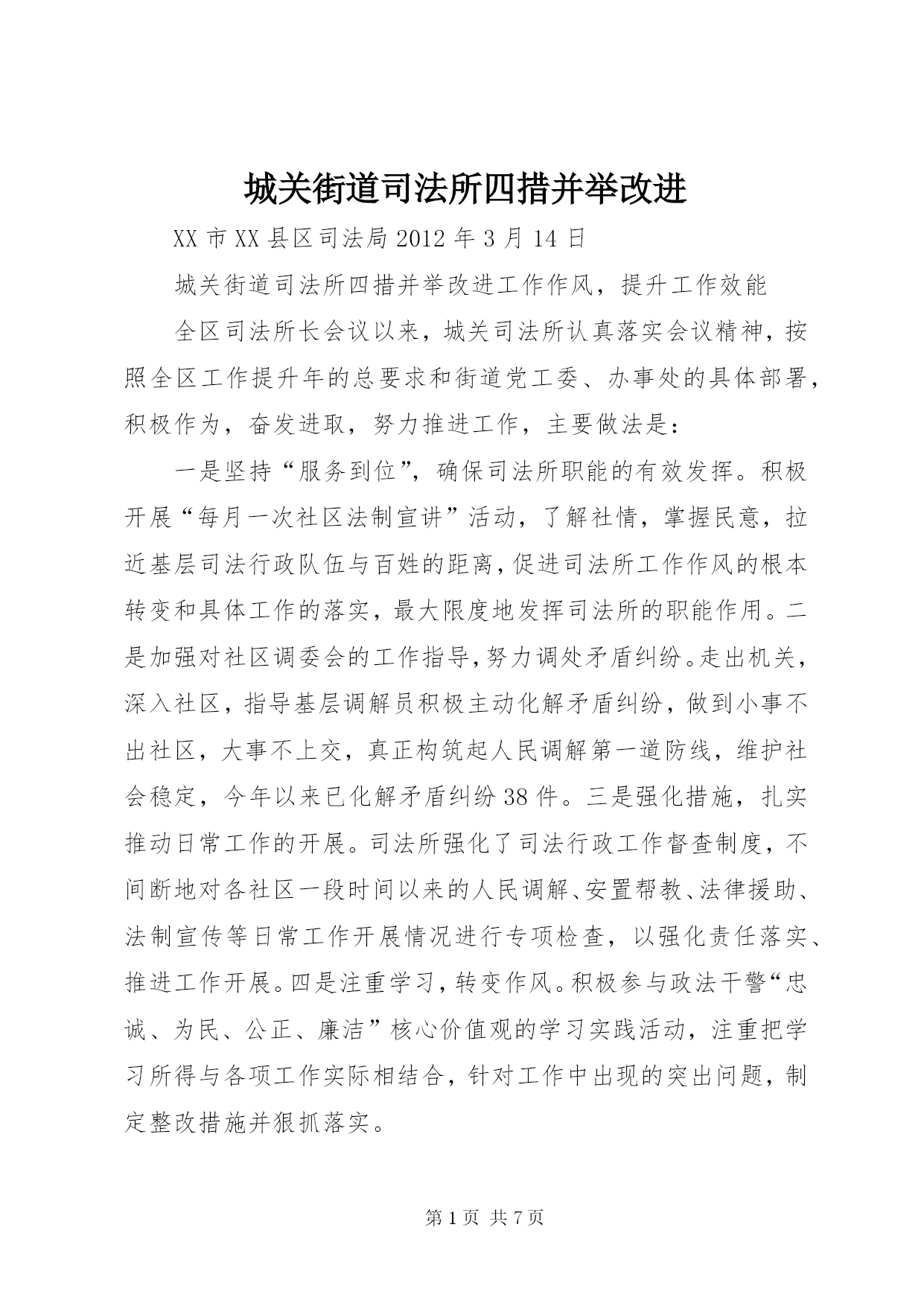 第PAGE\*Arabic\*MERGEFORMAT7页共NUMPAGES\*MERGEFORMAT7页城关街道司法所四措并举改进XX市XX县区司法局2012年3月14日城关街道司法所四措并举改进工作作风,提升工作效能全区司法所长会议以来,城关司法所认真落实会议精神,按照全区工作提升年的总要求和街道党工委、办事处的具体部署,积极作为,奋发进取,努力推进工作,主要做法是:一是坚持“服务到位”,确保司法所职能的有效发挥。积极开展“每月一次社区法制宣讲”活动,了解社情,掌握民意,拉近基层司法行政队伍
