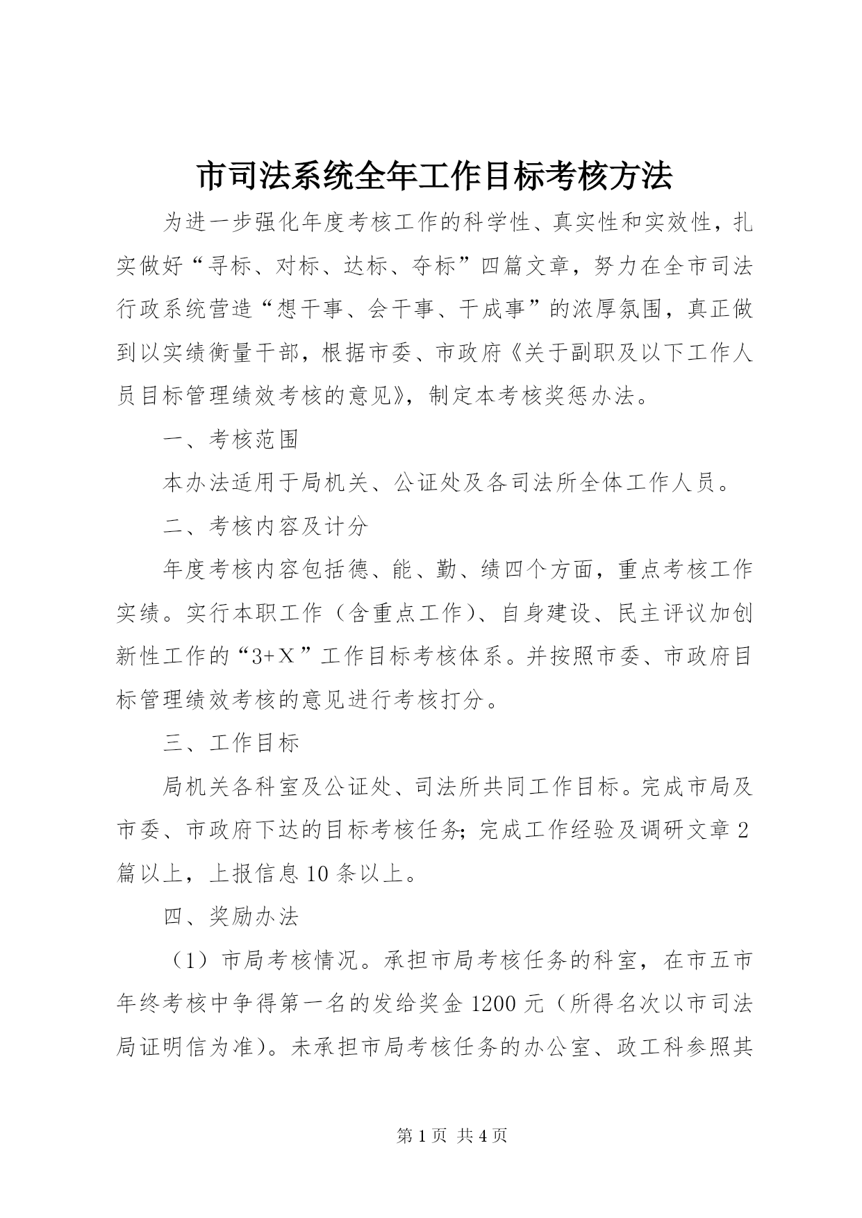 第PAGE\*Arabic\*MERGEFORMAT4页共NUMPAGES\*MERGEFORMAT4页市司法系统全年工作目标考核方法为进一步强化年度考核工作的科学性、真实性和实效性,扎实做好“寻标、对标、达标、夺标”四篇文章,努力在全市司法行政系统营造“想干事、会干事、干成事”的浓厚氛围,真正做到以实绩衡量干部,根据市委、市政府《关于副职及以下工作人员目标管理绩效考核的意见》,制定本考核奖惩办法。一、考核范围本办法适用于局机关、公证处及各司法所全体工作人员。二、考核内容及计分年度考核内容包括