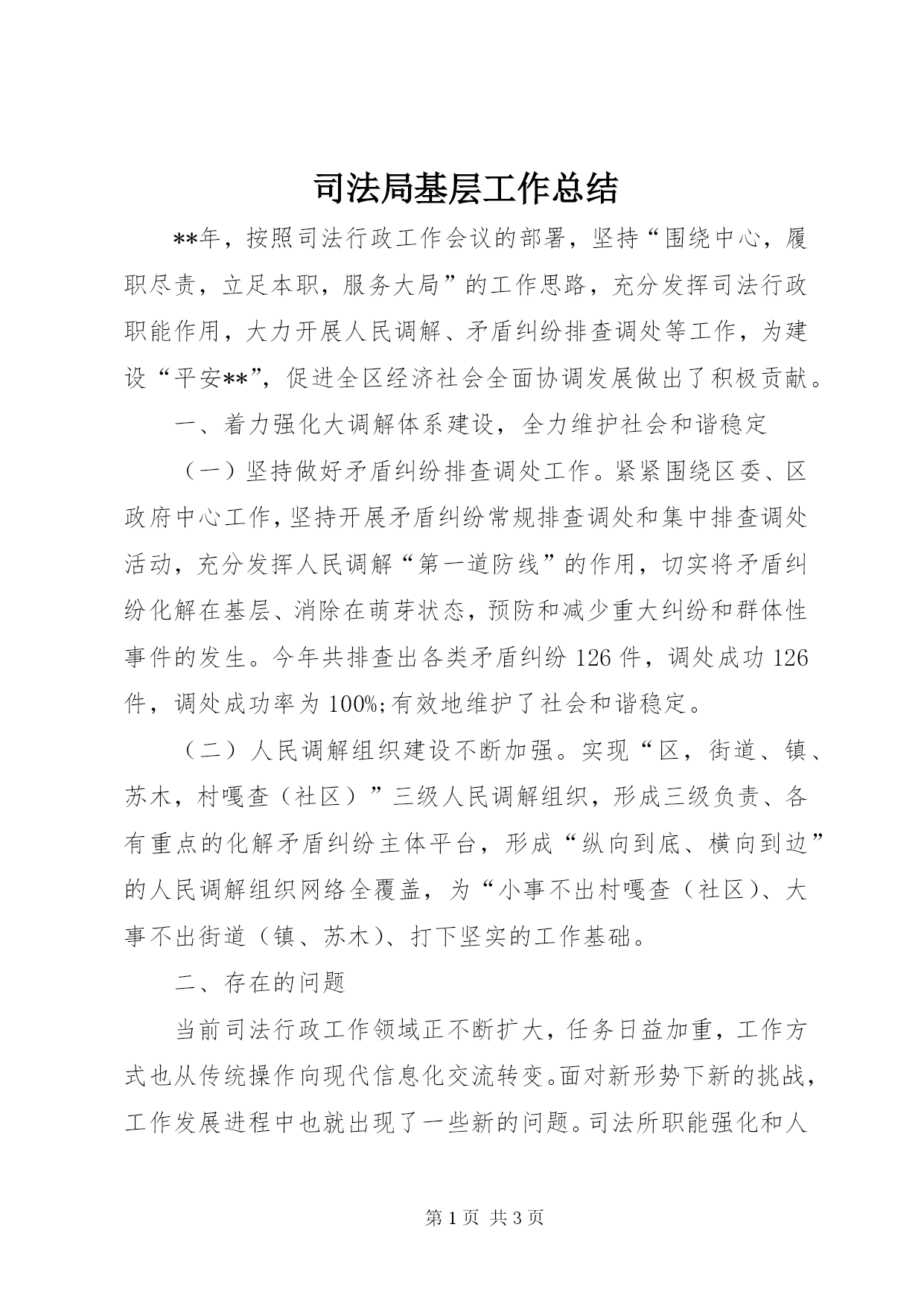 第PAGE\*Arabic\*MERGEFORMAT3页共NUMPAGES\*MERGEFORMAT3页司法局基层工作总结**年,按照司法行政工作会议的部署,坚持“围绕中心,履职尽责,立足本职,服务大局”的工作思路,充分发挥司法行政职能作用,大力开展人民调解、矛盾纠纷排查调处等工作,为建设“平安**”,促进全区经济社会全面协调发展做出了积极贡献。一、着力强化大调解体系建设,全力维护社会和谐稳定(一)坚持做好矛盾纠纷排查调处工作。紧紧围绕区委、区政府中心工作,坚持开展矛盾纠纷常规排查调处和集中排