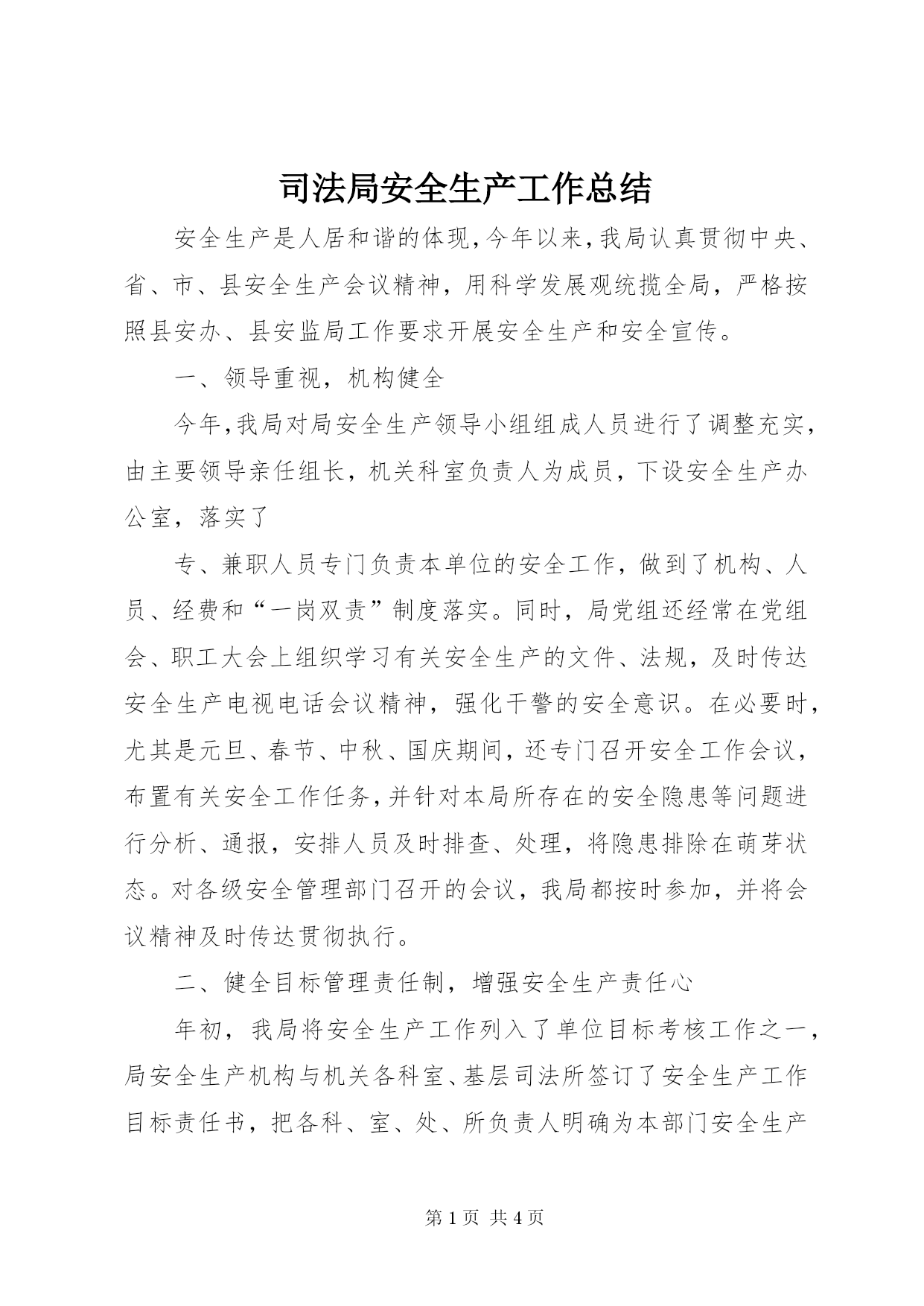 第PAGE\*Arabic\*MERGEFORMAT4页共NUMPAGES\*MERGEFORMAT4页司法局安全生产工作总结安全生产是人居和谐的体现,今年以来,我局认真贯彻中央、省、市、县安全生产会议精神,用科学发展观统揽全局,严格按照县安办、县安监局工作要求开展安全生产和安全宣传。一、领导重视,机构健全今年,我局对局安全生产领导小组组成人员进行了调整充实,由主要领导亲任组长,机关科室负责人为成员,下设安全生产办公室,落实了专、兼职人员专门负责本单位的安全工作,做到了机构、人员、经费和“一岗