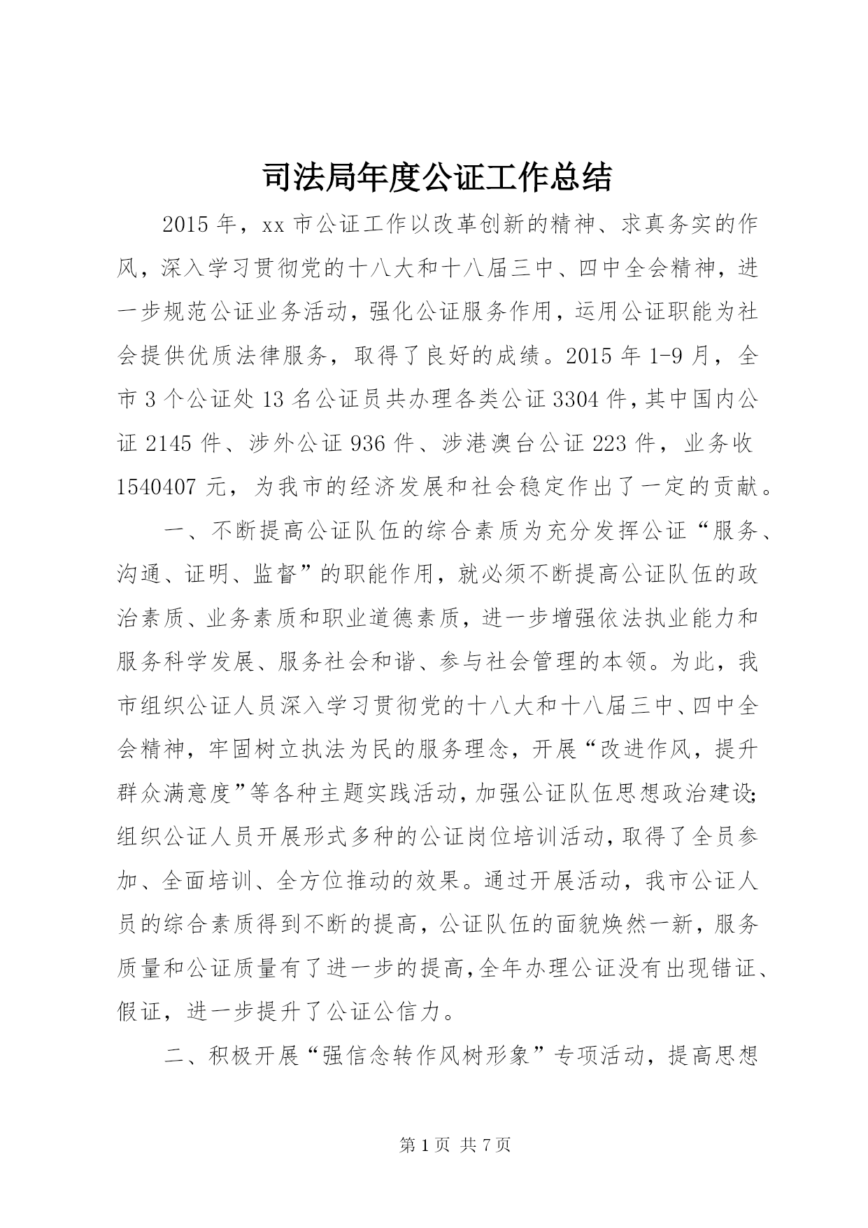 第PAGE\*Arabic\*MERGEFORMAT7页共NUMPAGES\*MERGEFORMAT7页司法局年度公证工作总结2015年,xx市公证工作以改革创新的精神、求真务实的作风,深入学习贯彻党的十八大和十八届三中、四中全会精神,进一步规范公证业务活动,强化公证服务作用,运用公证职能为社会提供优质法律服务,取得了良好的成绩。2015年1-9月,全市3个公证处13名公证员共办理各类公证3304件,其中国内公证2145件、涉外公证936件、涉港澳台公证223件,业务收1540407元,为我市