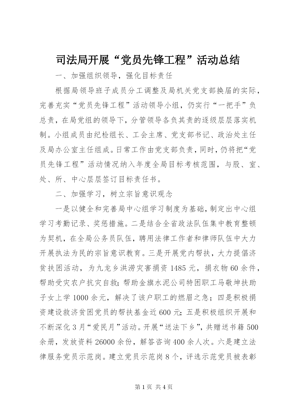 第PAGE\*Arabic\*MERGEFORMAT4页共NUMPAGES\*MERGEFORMAT4页司法局开展“党员先锋工程”活动总结一、加强组织领导,强化目标责任根据局领导班子成员分工调整及局机关党支部换届的实际,完善充实“党员先锋工程”活动领导小组,仍实行“一把手”负总责,在局党组的领导下,分管领导各负其责的逐级层层落实机制。小组成员由纪检组长、工会主席、党支部书记、政治处主任及局办公室主任组成。日常工作由党支部负责,同时,仍将把“党员先锋工程”活动情况纳入年度全局目标考核范围,与股、