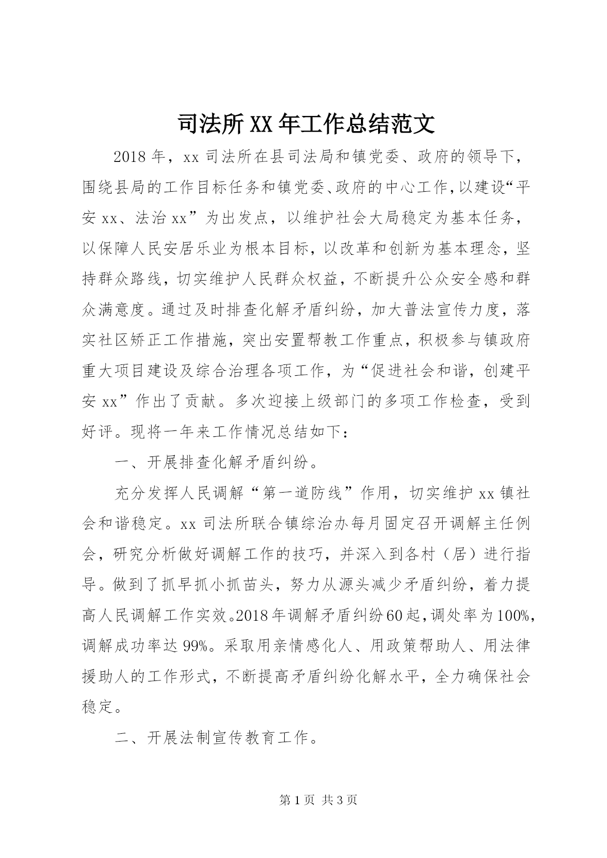 第PAGE\*Arabic\*MERGEFORMAT3页共NUMPAGES\*MERGEFORMAT3页司法所XX年工作总结范文2018年,xx司法所在县司法局和镇党委、政府的领导下,围绕县局的工作目标任务和镇党委、政府的中心工作,以建设“平安xx、法治xx”为出发点,以维护社会大局稳定为基本任务,以保障人民安居乐业为根本目标,以改革和创新为基本理念,坚持群众路线,切实维护人民群众权益,不断提升公众安全感和群众满意度。通过及时排查化解矛盾纠纷,加大普法宣传力度,落实社区矫正工作措施,突出安置帮