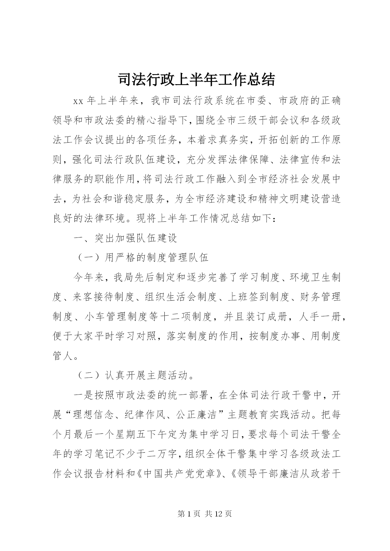 第PAGE\*Arabic\*MERGEFORMAT12页共NUMPAGES\*MERGEFORMAT12页司法行政上半年工作总结xx年上半年来,我市司法行政系统在市委、市政府的正确领导和市政法委的精心指导下,围绕全市三级干部会议和各级政法工作会议提出的各项任务,本着求真务实,开拓创新的工作原则,强化司法行政队伍建设,充分发挥法律保障、法律宣传和法律服务的职能作用,将司法行政工作融入到全市经济社会发展中去,为社会和谐稳定服务,为全市经济建设和精神文明建设营造良好的法律环境。现将上半年工作情况总