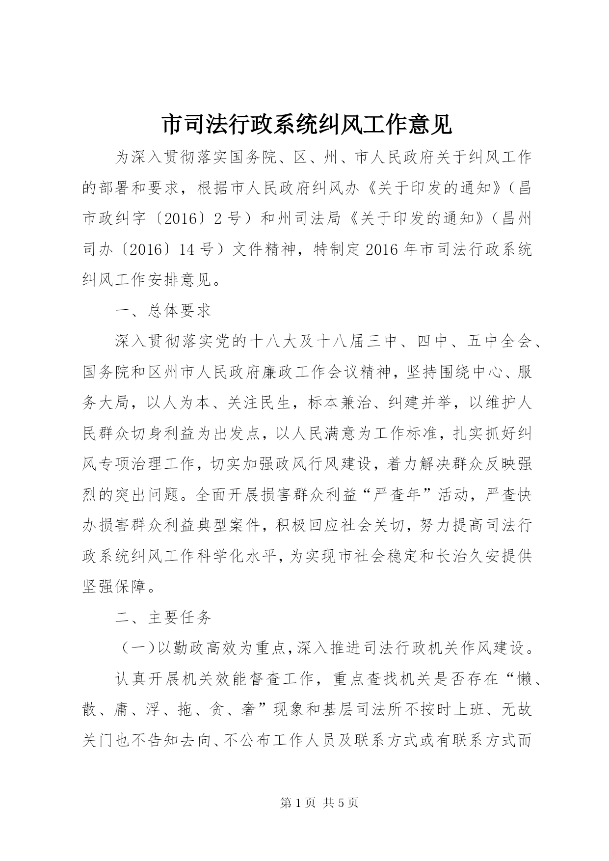 第PAGE\*Arabic\*MERGEFORMAT5页共NUMPAGES\*MERGEFORMAT5页市司法行政系统纠风工作意见为深入贯彻落实国务院、区、州、市人民政府关于纠风工作的部署和要求,根据市人民政府纠风办《关于印发的通知》(昌市政纠字〔2016〕2号)和州司法局《关于印发的通知》(昌州司办〔2016〕14号)文件精神,特制定2016年市司法行政系统纠风工作安排意见。一、总体要求深入贯彻落实党的十八大及十八届三中、四中、五中全会、国务院和区州市人民政府廉政工作会议精神,坚持围绕中心、