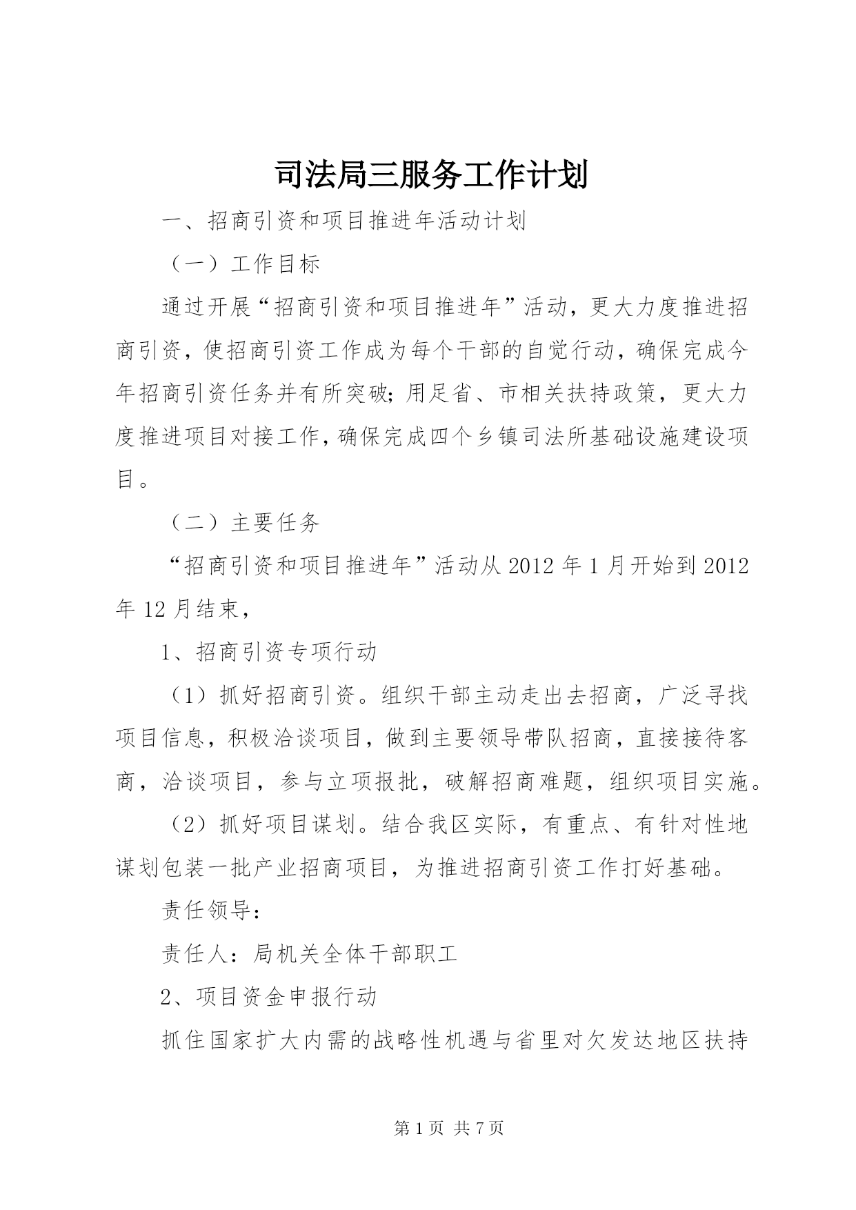 第PAGE\*Arabic\*MERGEFORMAT7页共NUMPAGES\*MERGEFORMAT7页司法局三服务工作计划一、招商引资和项目推进年活动计划(一)工作目标通过开展“招商引资和项目推进年”活动,更大力度推进招商引资,使招商引资工作成为每个干部的自觉行动,确保完成今年招商引资任务并有所突破;用足省、市相关扶持政策,更大力度推进项目对接工作,确保完成四个乡镇司法所基础设施建设项目。(二)主要任务“招商引资和项目推进年”活动从2012年1月开始到2012年12月结束,1、招商引资专项行
