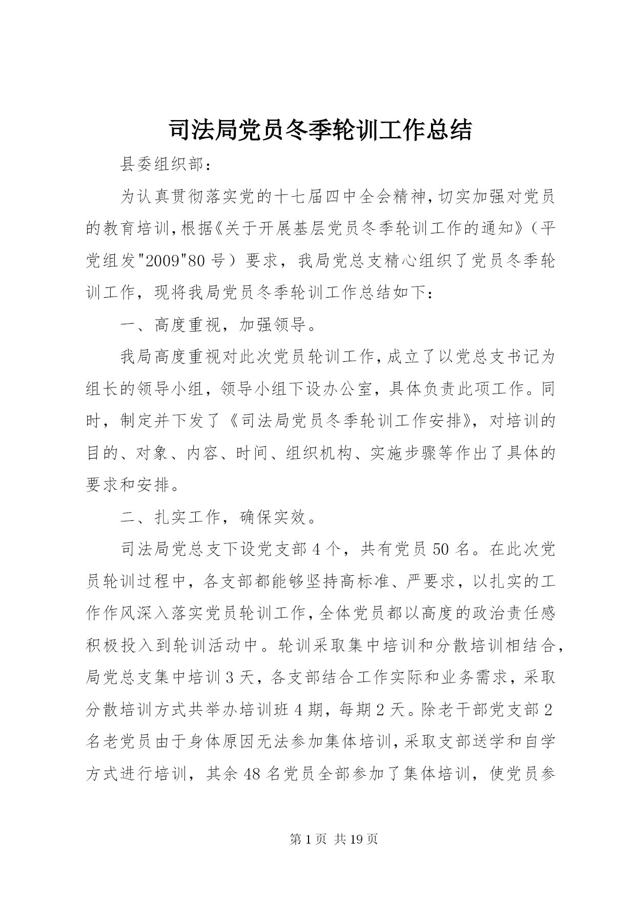 第PAGE\*Arabic\*MERGEFORMAT19页共NUMPAGES\*MERGEFORMAT19页司法局党员冬季轮训工作总结县委组织部:为认真贯彻落实党的十七届四中全会精神,切实加强对党员的教育培训,根据《关于开展基层党员冬季轮训工作的通知》(平党组发"2009"80号)要求,我局党总支精心组织了党员冬季轮训工作,现将我局党员冬季轮训工作总结如下:一、高度重视,加强领导。我局高度重视对此次党员轮训工作,成立了以党总支书记为组长的领导小组,领导小组下设办公室,具体负责此项工作。同时,制
