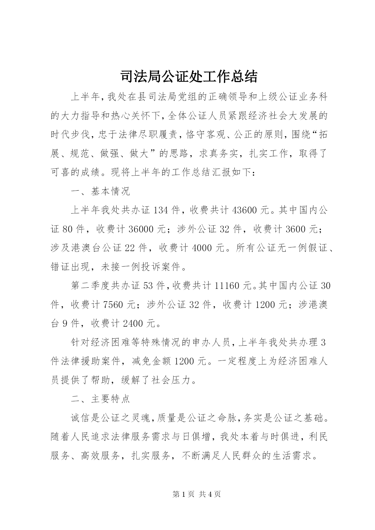 第PAGE\*Arabic\*MERGEFORMAT4页共NUMPAGES\*MERGEFORMAT4页司法局公证处工作总结上半年,我处在县司法局党组的正确领导和上级公证业务科的大力指导和热心关怀下,全体公证人员紧跟经济社会大发展的时代步伐,忠于法律尽职履责,恪守客观、公正的原则,围绕“拓展、规范、做强、做大”的思路,求真务实,扎实工作,取得了可喜的成绩。现将上半年的工作总结汇报如下:一、基本情况上半年我处共办证134件,收费共计43600元。其中国内公证80件,收费计36000元;涉外公证3