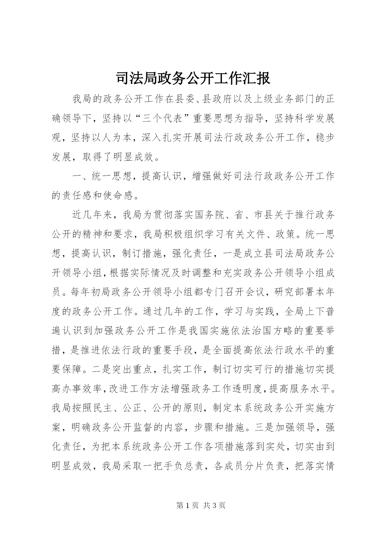 第PAGE\*Arabic\*MERGEFORMAT3页共NUMPAGES\*MERGEFORMAT3页司法局政务公开工作汇报我局的政务公开工作在县委、县政府以及上级业务部门的正确领导下,坚持以“三个代表”重要思想为指导,坚持科学发展观,坚持以人为本,深入扎实开展司法行政政务公开工作,稳步发展,取得了明显成效。一、统一思想,提高认识,增强做好司法行政政务公开工作的责任感和使命感。近几年来,我局为贯彻落实国务院、省、市县关于推行政务公开的精神和要求,我局积极组织学习有关文件、政策。统一思想,提高