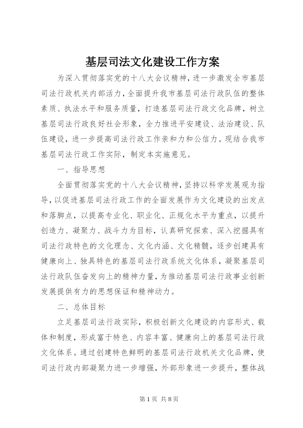 第PAGE\*Arabic\*MERGEFORMAT8页共NUMPAGES\*MERGEFORMAT8页基层司法文化建设工作方案为深入贯彻落实党的十八大会议精神,进一步激发全市基层司法行政机关内部活力,全面提升我市基层司法行政队伍的整体素质、执法水平和服务质量,打造基层司法行政文化品牌,树立基层司法行政良好社会形象,全力推进平安建设、法治建设、队伍建设,进一步提高司法行政工作亲和力和公信力。现结合我市基层司法行政工作实际,制定本实施意见。一、指导思想全面贯彻落实党的十八大会议精神,坚持以科学发