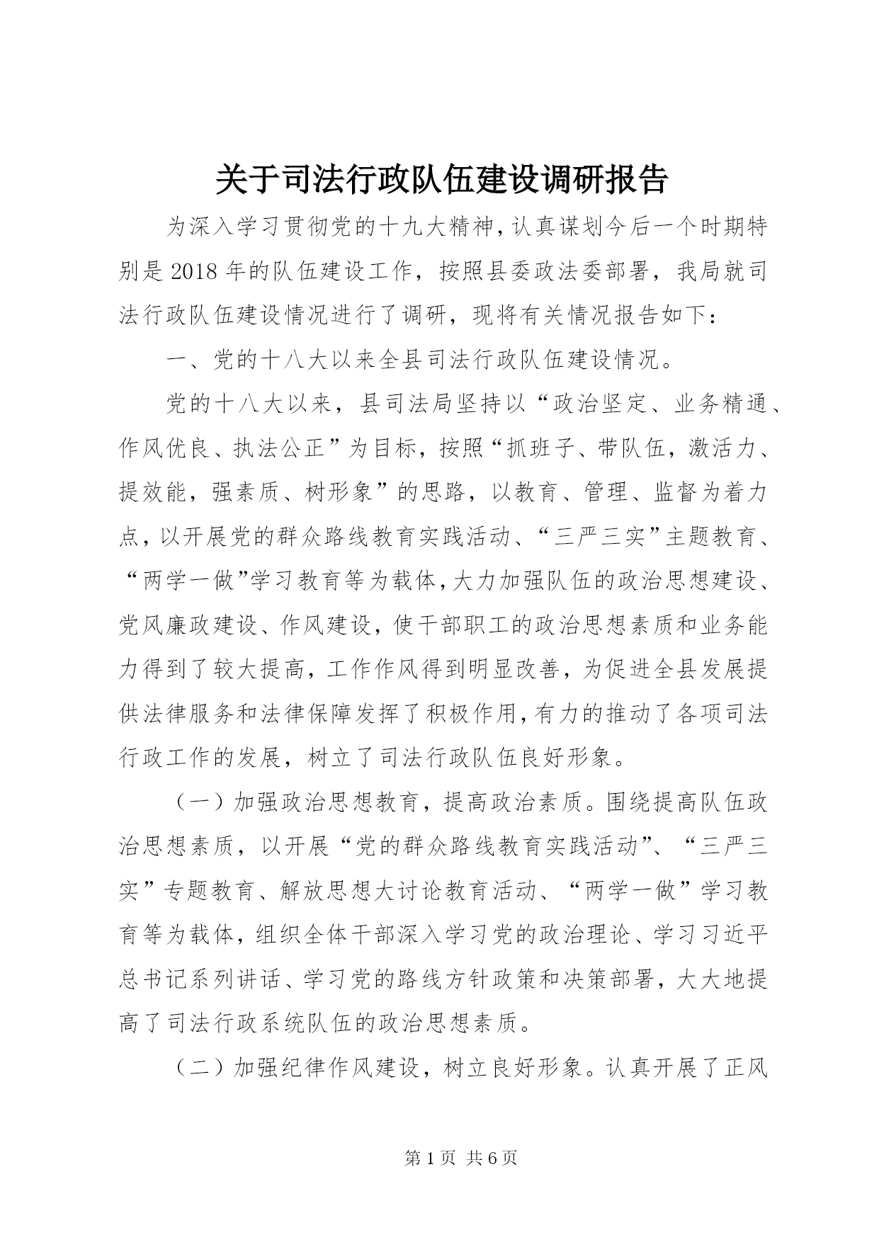 第PAGE\*Arabic\*MERGEFORMAT6页共NUMPAGES\*MERGEFORMAT6页关于司法行政队伍建设调研报告为深入学习贯彻党的十九大精神,认真谋划今后一个时期特别是2018年的队伍建设工作,按照县委政法委部署,我局就司法行政队伍建设情况进行了调研,现将有关情况报告如下:一、党的十八大以来全县司法行政队伍建设情况。党的十八大以来,县司法局坚持以“政治坚定、业务精通、作风优良、执法公正”为目标,按照“抓班子、带队伍,激活力、提效能,强素质、树形象”的思路,以教育、管理、监督
