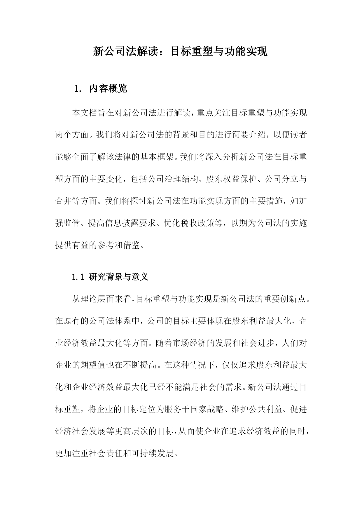 新公司法解读:目标重塑与功能实现1.内容概览本文档旨在对新公司法进行解读,重点关注目标重塑与功能实现两个方面。我们将对新公司法的背景和目的进行简要介绍,以便读者能够全面了解该法律的基本框架。我们将深入分析新公司法在目标重塑方面的主要变化,包括公司治理结构、股东权益保护、公司分立与合并等方面。我们将探讨新公司法在功能实现方面的主要措施,如加强监管、提高信息披露要求、优化税收政策等,以期为公司法的实施提供有益的参考和借鉴。1.1研究背景与意义从理论层面来看,目标重塑与功能实现是新公司法的重要创新点。在原有的公