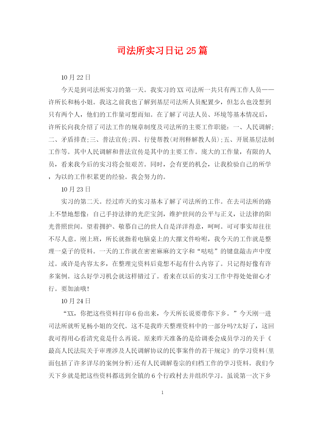 此资料由网络收集而来,如有侵权请告知上传者立即删除。资料共分享,我们负责传递知识。PAGEPAGE12司法所实习日记25篇10月22日今天是到司法所实习的第一天。我实习的XX司法所一共只有两工作人员——许所长和杨小姐。我这之前我也了解到基层司法所人员配置少,但怎么也没想到只有两个人,他们的工作量可想而知。在了解了司法人员、环境等基本情况后,许所长向我介绍了司法工作的规章制度及司法所的主要工作职能:一、人民调解;二、矛盾排查;三、普法宣传;四、行使帮教(对刑释解教人员);五、开展基层法制工作等。
