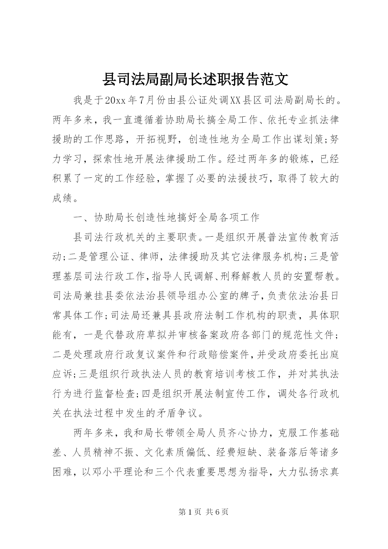 第PAGE\*Arabic\*MERGEFORMAT6页共NUMPAGES\*MERGEFORMAT6页县司法局副局长述职报告范文我是于20xx年7月份由县公证处调XX县区司法局副局长的。两年多来,我一直遵循着协助局长搞全局工作、依托专业抓法律援助的工作思路,开拓视野,创造性地为全局工作出谋划策;努力学习,探索性地开展法律援助工作。经过两年多的锻炼,已经积累了一定的工作经验,掌握了必要的法援技巧,取得了较大的成绩。一、协助局长创造性地搞好全局各项工作县司法行政机关的主要职责。一是组织开展普法宣