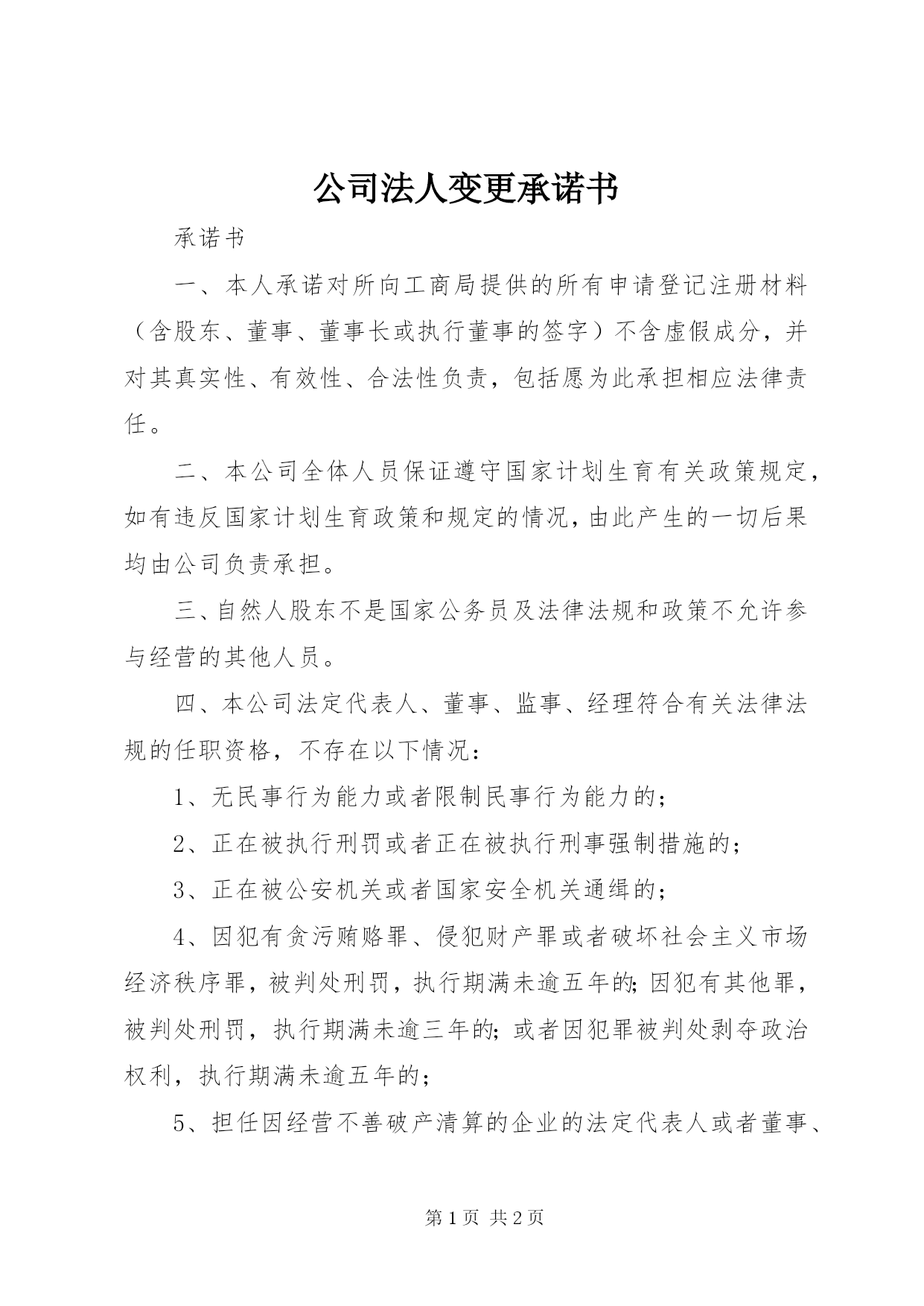 第PAGE\*Arabic\*MERGEFORMAT2页共NUMPAGES\*MERGEFORMAT2页公司法人变更承诺书承诺书一、本人承诺对所向工商局提供的所有申请登记注册材料(含股东、董事、董事长或执行董事的签字)不含虚假成分,并对其真实性、有效性、合法性负责,包括愿为此承担相应法律责任。二、本公司全体人员保证遵守国家计划生育有关政策规定,如有违反国家计划生育政策和规定的情况,由此产生的一切后果均由公司负责承担。三、自然人股东不是国家公务员及法律法规和政策不允许参与经营的其他人员。四、本公