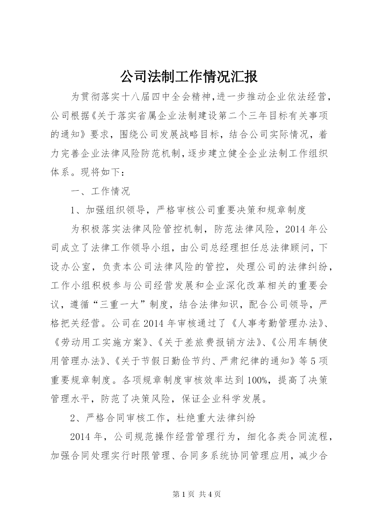 第PAGE\*Arabic\*MERGEFORMAT4页共NUMPAGES\*MERGEFORMAT4页公司法制工作情况汇报为贯彻落实十八届四中全会精神,进一步推动企业依法经营,公司根据《关于落实省属企业法制建设第二个三年目标有关事项的通知》要求,围绕公司发展战略目标,结合公司实际情况,着力完善企业法律风险防范机制,逐步建立健全企业法制工作组织体系。现将如下:一、工作情况1、加强组织领导,严格审核公司重要决策和规章制度为积极落实法律风险管控机制,防范法律风险,2014年公司成立了法律工作领导小