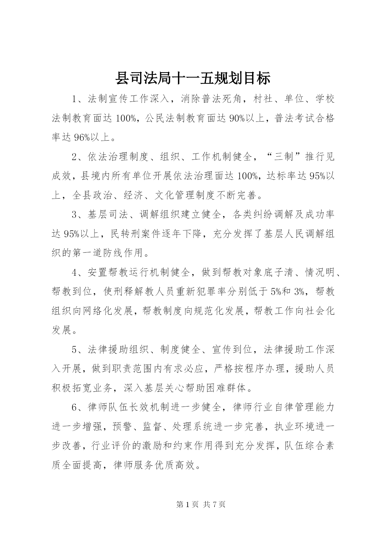 第PAGE\*Arabic\*MERGEFORMAT7页共NUMPAGES\*MERGEFORMAT7页县司法局十一五规划目标1、法制宣传工作深入,消除普法死角,村社、单位、学校法制教育面达100%,公民法制教育面达90%以上,普法考试合格率达96%以上。2、依法治理制度、组织、工作机制健全,“三制”推行见成效,县境内所有单位开展依法治理面达100%,达标率达95%以上,全县政治、经济、文化管理制度不断完善。3、基层司法、调解组织建立健全,各类纠纷调解及成功率达95%以上,民转刑案件逐年下降,