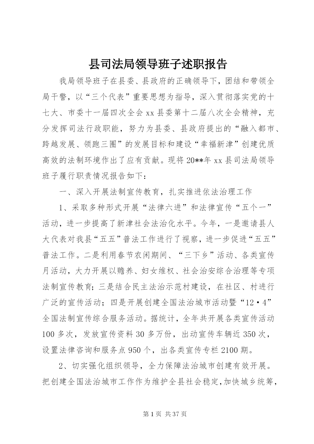 第PAGE\*Arabic\*MERGEFORMAT37页共NUMPAGES\*MERGEFORMAT37页县司法局领导班子述职报告我局领导班子在县委、县政府的正确领导下,团结和带领全局干警,以“三个代表”重要思想为指导,深入贯彻落实党的十七大、市委十一届四次全会xx县委第十二届八次全会精神,充分发挥司法行政职能,努力为县委、县政府提出的“融入都市、跨越发展、领跑三圈”的发展目标和建设“幸福新津”创建优质高效的法制环境作出了应有贡献。现将20**年xx县司法局领导班子履行职责情况报告如下:一、