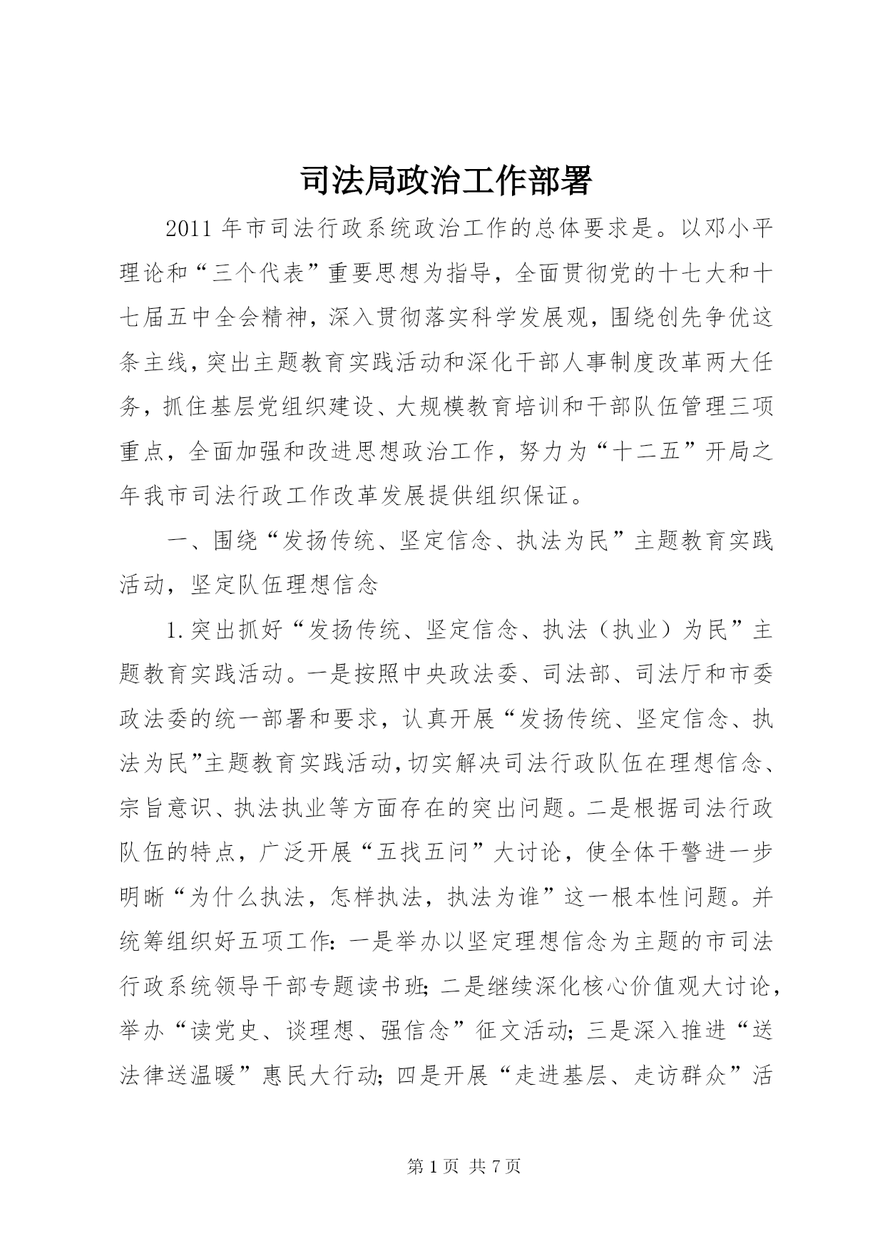 第PAGE\*Arabic\*MERGEFORMAT7页共NUMPAGES\*MERGEFORMAT7页司法局政治工作部署2011年市司法行政系统政治工作的总体要求是。以邓小平理论和“三个代表”重要思想为指导,全面贯彻党的十七大和十七届五中全会精神,深入贯彻落实科学发展观,围绕创先争优这条主线,突出主题教育实践活动和深化干部人事制度改革两大任务,抓住基层党组织建设、大规模教育培训和干部队伍管理三项重点,全面加强和改进思想政治工作,努力为“十二五”开局之年我市司法行政工作改革发展提供组织保证。一