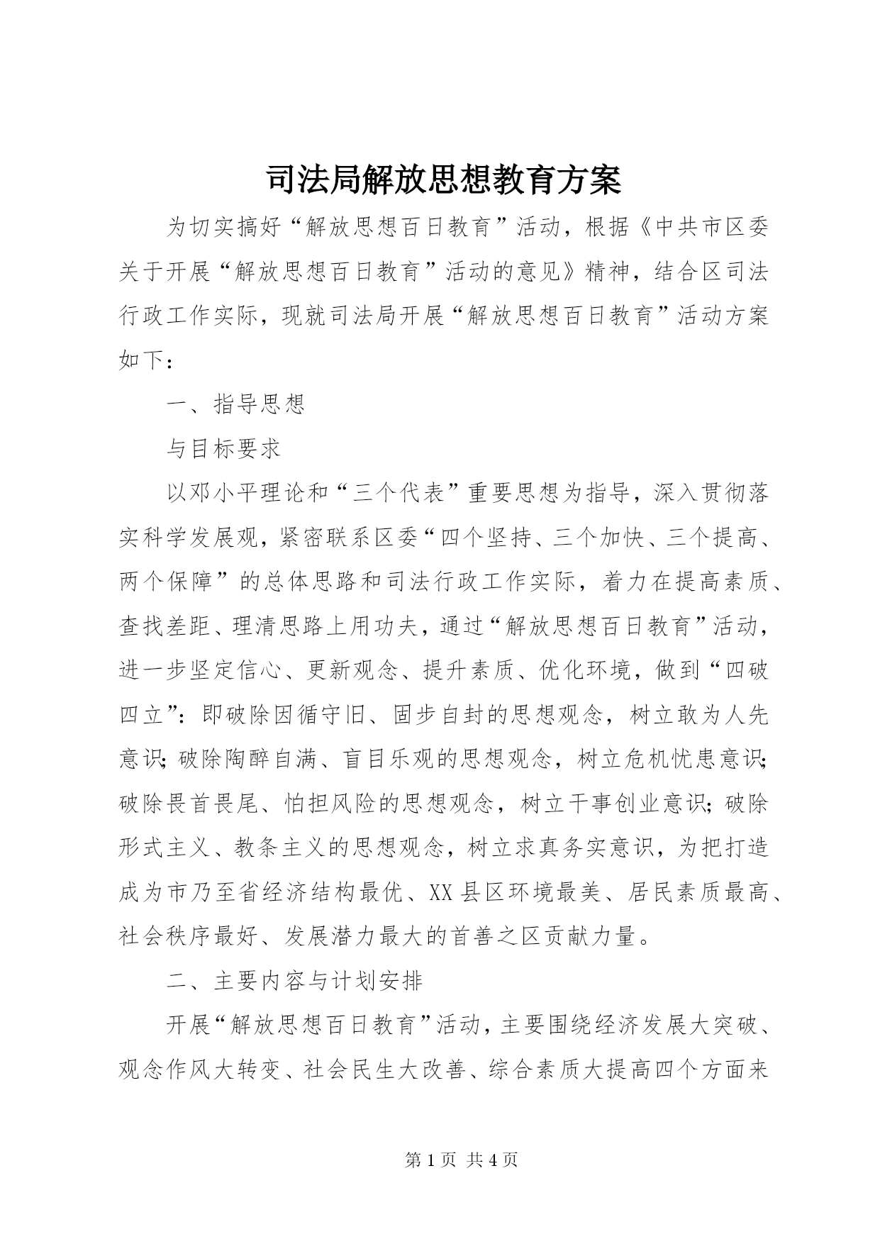 第PAGE\*Arabic\*MERGEFORMAT4页共NUMPAGES\*MERGEFORMAT4页司法局解放思想教育方案为切实搞好“解放思想百日教育”活动,根据《中共市区委关于开展“解放思想百日教育”活动的意见》精神,结合区司法行政工作实际,现就司法局开展“解放思想百日教育”活动方案如下:一、指导思想与目标要求以邓小平理论和“三个代表”重要思想为指导,深入贯彻落实科学发展观,紧密联系区委“四个坚持、三个加快、三个提高、两个保障”的总体思路和司法行政工作实际,着力在提高素质、查找差距、理清