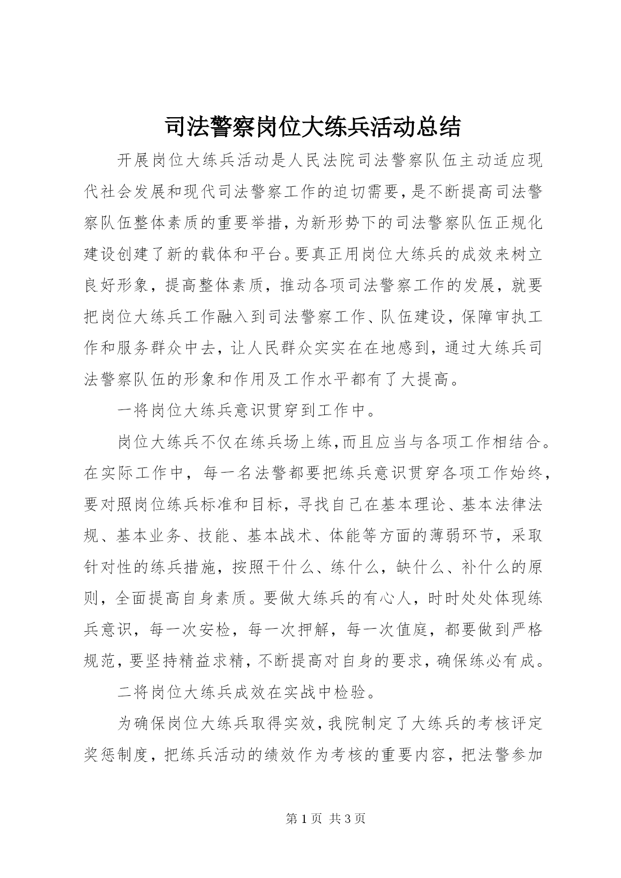 第PAGE\*Arabic\*MERGEFORMAT3页共NUMPAGES\*MERGEFORMAT3页司法警察岗位大练兵活动总结开展岗位大练兵活动是人民法院司法警察队伍主动适应现代社会发展和现代司法警察工作的迫切需要,是不断提高司法警察队伍整体素质的重要举措,为新形势下的司法警察队伍正规化建设创建了新的载体和平台。要真正用岗位大练兵的成效来树立良好形象,提高整体素质,推动各项司法警察工作的发展,就要把岗位大练兵工作融入到司法警察工作、队伍建设,保障审执工作和服务群众中去,让人民群众实实在在地