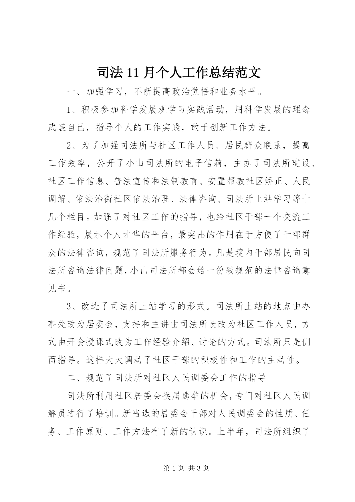 第PAGE\*Arabic\*MERGEFORMAT3页共NUMPAGES\*MERGEFORMAT3页司法11月个人工作总结范文一、加强学习,不断提高政治觉悟和业务水平。1、积极参加科学发展观学习实践活动,用科学发展的理念武装自己,指导个人的工作实践,敢于创新工作方法。2、为了加强司法所与社区工作人员、居民群众联系,提高工作效率,公开了小山司法所的电子信箱,主办了司法所建设、社区工作信息、普法宣传和法制教育、安置帮教社区矫正、人民调解、依法治街社区依法治理、法律咨询、司法所上站学习等十几个栏