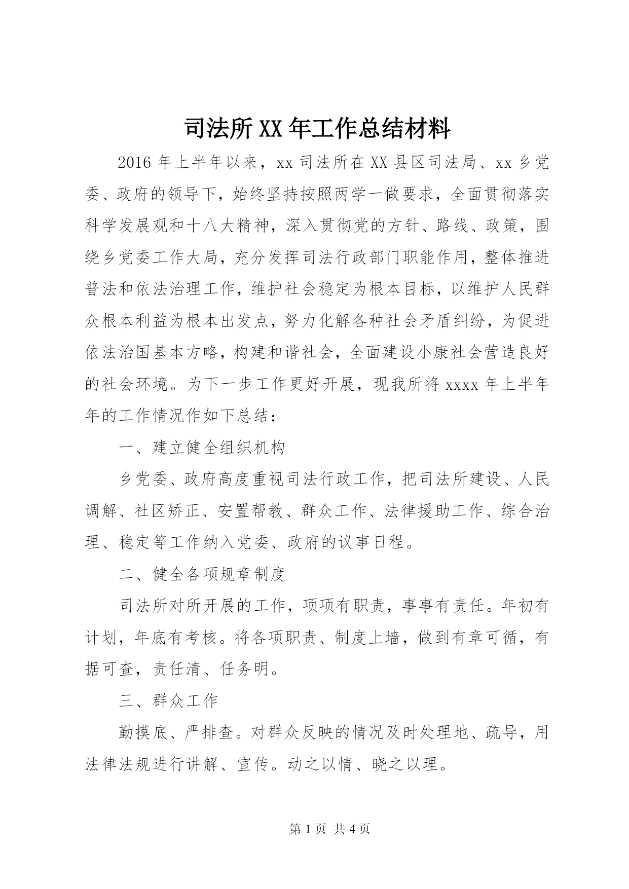 第PAGE\*Arabic\*MERGEFORMAT4页共NUMPAGES\*MERGEFORMAT4页司法所XX年工作总结材料2016年上半年以来,xx司法所在XX县区司法局、xx乡党委、政府的领导下,始终坚持按照两学一做要求,全面贯彻落实科学发展观和十八大精神,深入贯彻党的方针、路线、政策,围绕乡党委工作大局,充分发挥司法行政部门职能作用,整体推进普法和依法治理工作,维护社会稳定为根本目标,以维护人民群众根本利益为根本出发点,努力化解各种社会矛盾纠纷,为促进依法治国基本方略,构建和谐社会,