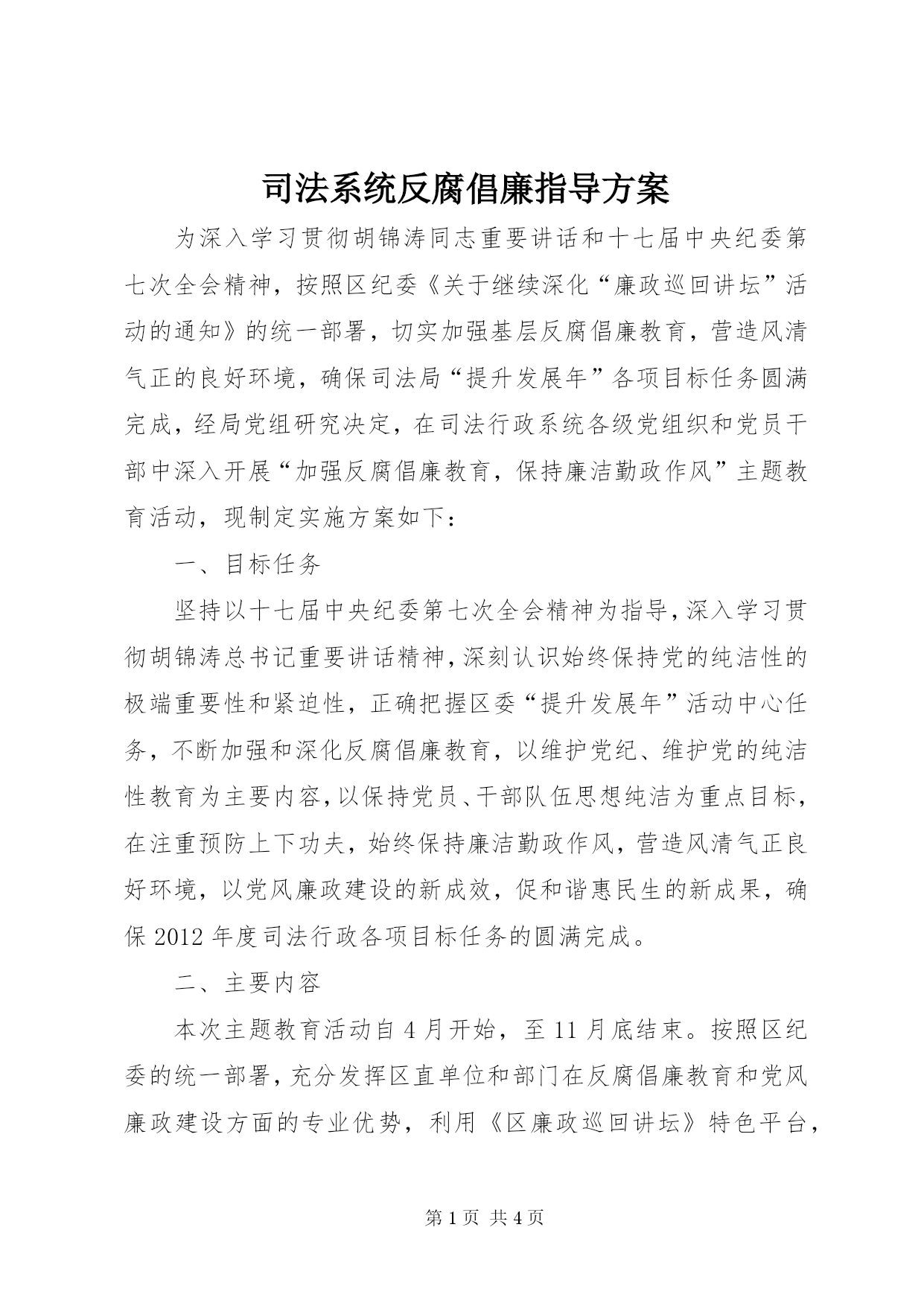 第PAGE\*Arabic\*MERGEFORMAT4页共NUMPAGES\*MERGEFORMAT4页司法系统反腐倡廉指导方案为深入学习贯彻胡锦涛同志重要讲话和十七届中央纪委第七次全会精神,按照区纪委《关于继续深化“廉政巡回讲坛”活动的通知》的统一部署,切实加强基层反腐倡廉教育,营造风清气正的良好环境,确保司法局“提升发展年”各项目标任务圆满完成,经局党组研究决定,在司法行政系统各级党组织和党员干部中深入开展“加强反腐倡廉教育,保持廉洁勤政作风”主题教育活动,现制定实施方案如下:一、目标任务