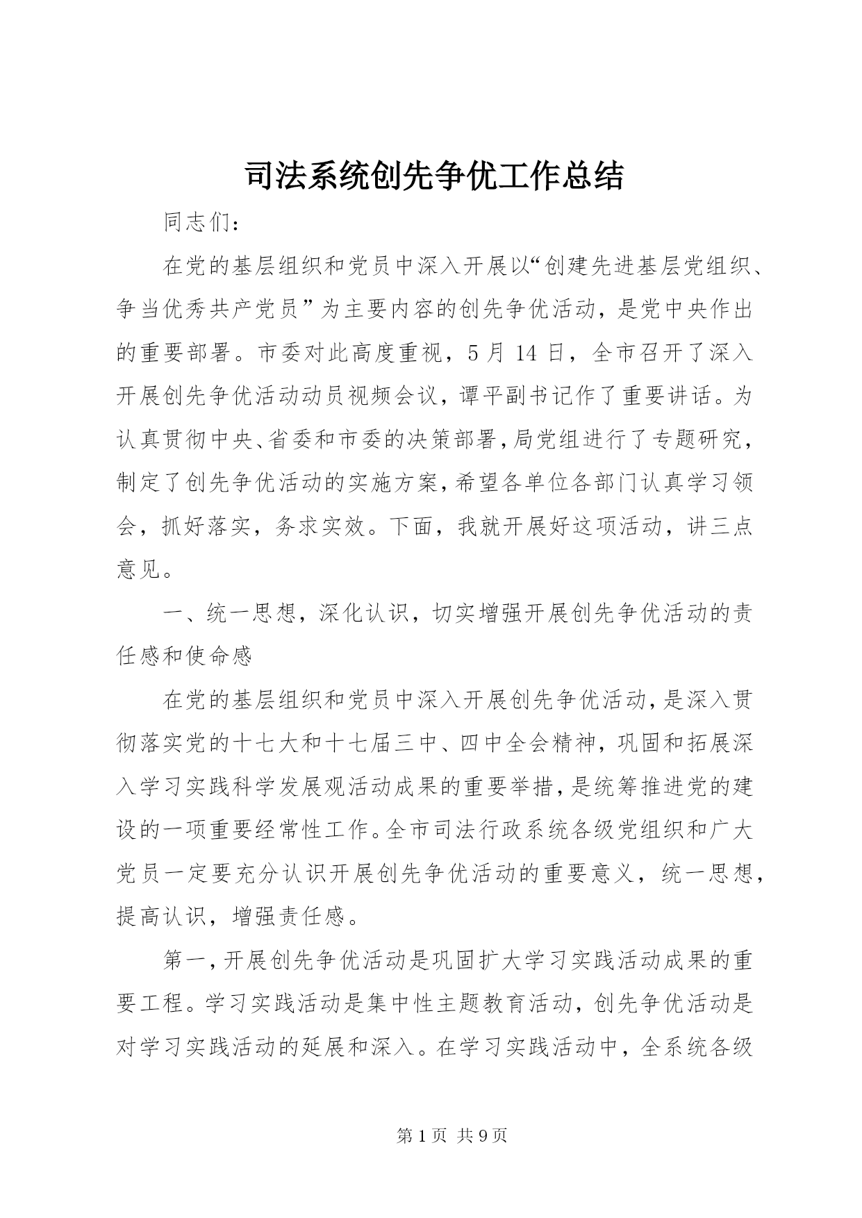 第PAGE\*Arabic\*MERGEFORMAT9页共NUMPAGES\*MERGEFORMAT9页司法系统创先争优工作总结同志们:在党的基层组织和党员中深入开展以“创建先进基层党组织、争当优秀共产党员”为主要内容的创先争优活动,是党中央作出的重要部署。市委对此高度重视,5月14日,全市召开了深入开展创先争优活动动员视频会议,谭平副书记作了重要讲话。为认真贯彻中央、省委和市委的决策部署,局党组进行了专题研究,制定了创先争优活动的实施方案,希望各单位各部门认真学习领会,抓好落实,务求实效。下