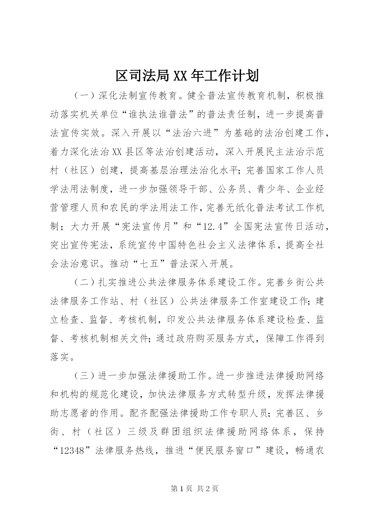 第PAGE\*Arabic\*MERGEFORMAT2页共NUMPAGES\*MERGEFORMAT2页区司法局XX年工作计划(一)深化法制宣传教育。健全普法宣传教育机制,积极推动落实机关单位“谁执法谁普法”的普法责任制,进一步提高普法宣传实效。深入开展以“法治六进”为基础的法治创建工作,着力深化法治XX县区等法治创建活动,深入开展民主法治示范村(社区)创建,提高基层治理法治化水平;完善国家工作人员学法用法制度,进一步加强领导干部、公务员、青少年、企业经营管理人员和农民的学法用法工作,完善无纸