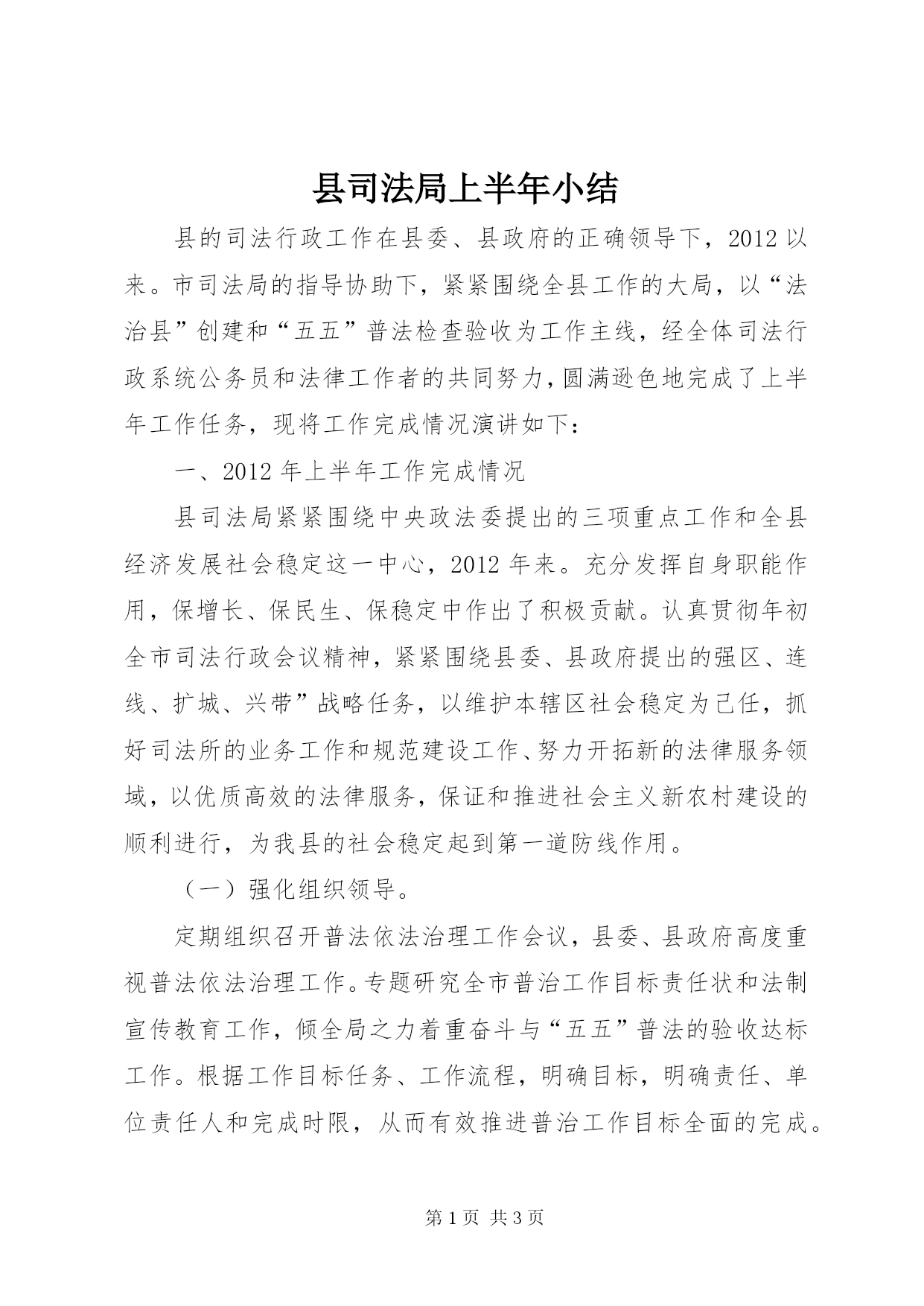 第PAGE\*Arabic\*MERGEFORMAT3页共NUMPAGES\*MERGEFORMAT3页县司法局上半年小结县的司法行政工作在县委、县政府的正确领导下,2012以来。市司法局的指导协助下,紧紧围绕全县工作的大局,以“法治县”创建和“五五”普法检查验收为工作主线,经全体司法行政系统公务员和法律工作者的共同努力,圆满逊色地完成了上半年工作任务,现将工作完成情况演讲如下:一、2012年上半年工作完成情况县司法局紧紧围绕中央政法委提出的三项重点工作和全县经济发展社会稳定这一中心,2012