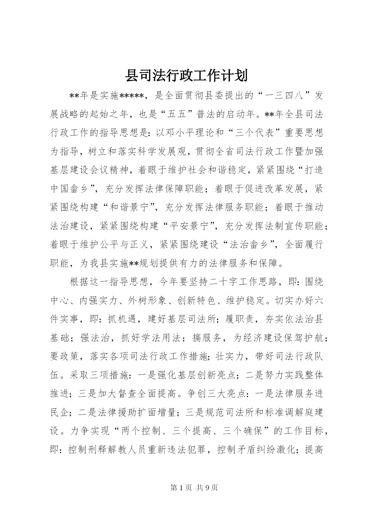 第PAGE\*Arabic\*MERGEFORMAT9页共NUMPAGES\*MERGEFORMAT9页县司法行政工作计划**年是实施*****,是全面贯彻县委提出的“一三四八”发展战略的起始之年,也是“五五”普法的启动年。**年全县司法行政工作的指导思想是:以邓小平理论和“三个代表”重要思想为指导,树立和落实科学发展观,贯彻全省司法行政工作暨加强基层建设会议精神,着眼于维护社会和谐稳定,紧紧围绕“打造中国畲乡”,充分发挥法律保障职能;着眼于促进改革发展,紧紧围绕构建“和谐景宁”,充分发挥法律