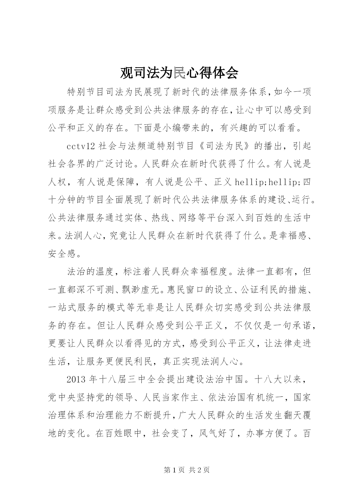 第PAGE\*Arabic\*MERGEFORMAT2页共NUMPAGES\*MERGEFORMAT2页观司法为民心得体会特别节目司法为民展现了新时代的法律服务体系,如今一项项服务是让群众感受到公共法律服务的存在,让心中可以感受到公平和正义的存在。下面是小编带来的,有兴趣的可以看看。cctv12社会与法频道特别节目《司法为民》的播出,引起社会各界的广泛讨论。人民群众在新时代获得了什么。有人说是人权,有人说是保障,有人说是公平、正义hellip;hellip;四十分钟的节目全面展现了新时代公共法