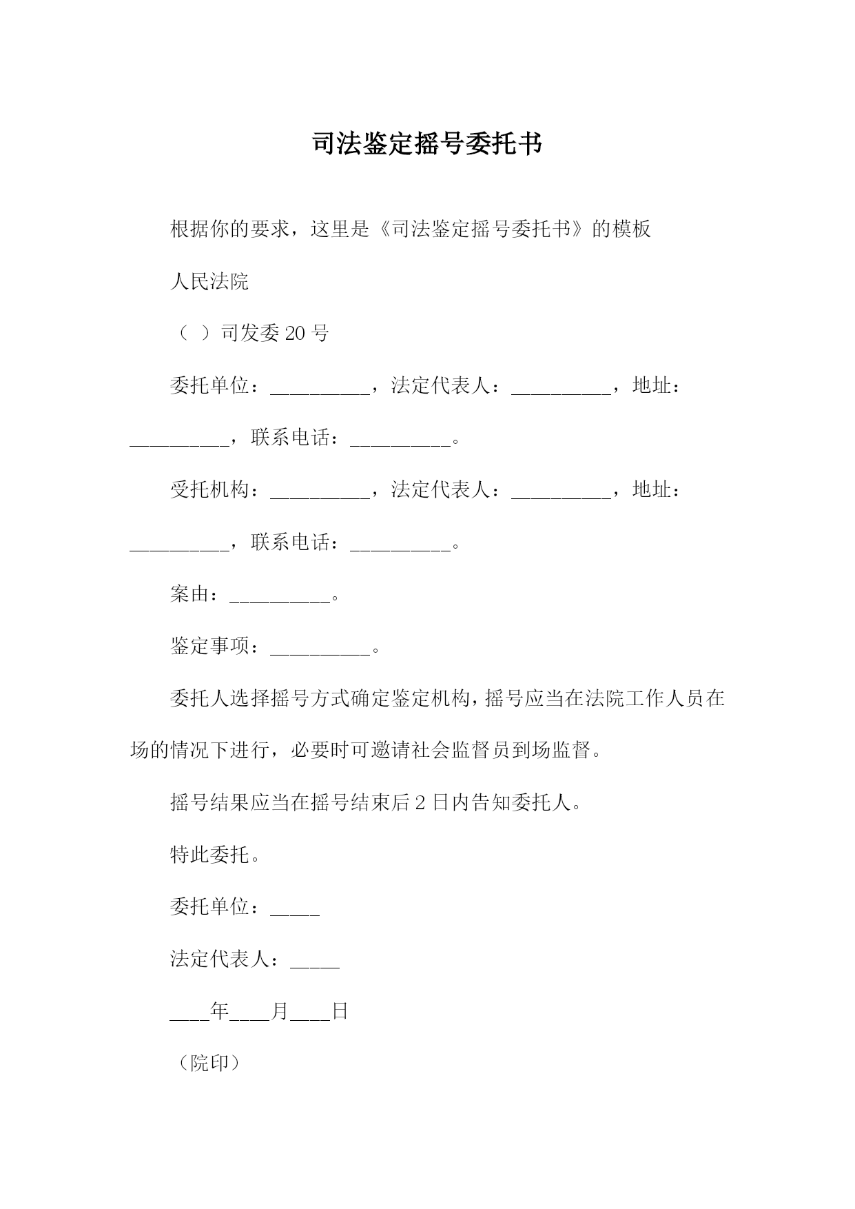 司法鉴定摇号委托书根据你的要求,这里是《司法鉴定摇号委托书》的模板人民法院()司发委20号委托单位:__________,法定代表人:__________,地址:__________,联系电话:__________。受托机构:__________,法定代表人:__________,地址:__________,联系电话:__________。案由:__________。鉴定事项:__________。委托人选择摇号方式确定鉴定机构,摇号应当在法院工作人员在场的情况下进行,必要时可邀请社会监督员到场监督。摇号