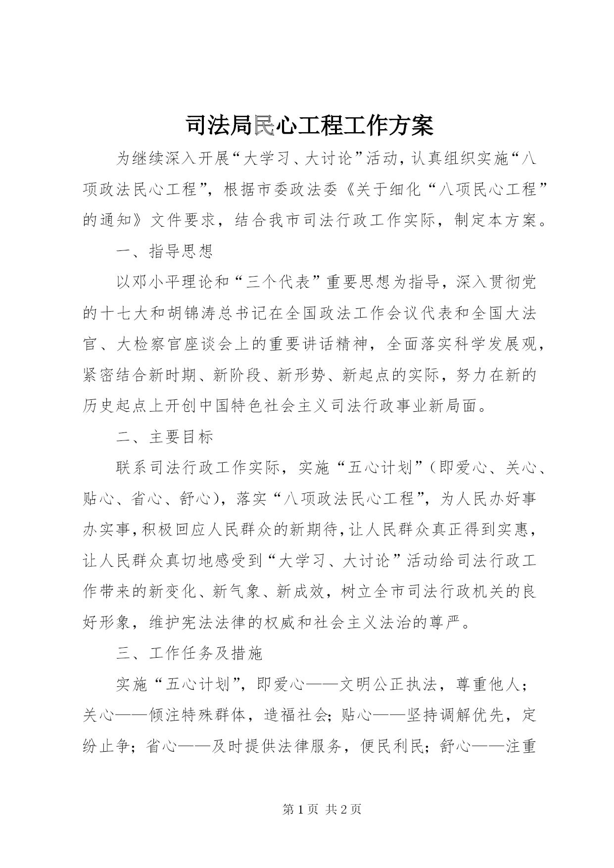 第PAGE\*Arabic\*MERGEFORMAT2页共NUMPAGES\*MERGEFORMAT2页司法局民心工程工作方案为继续深入开展“大学习、大讨论”活动,认真组织实施“八项政法民心工程”,根据市委政法委《关于细化“八项民心工程”的通知》文件要求,结合我市司法行政工作实际,制定本方案。一、指导思想以邓小平理论和“三个代表”重要思想为指导,深入贯彻党的十七大和胡锦涛总书记在全国政法工作会议代表和全国大法官、大检察官座谈会上的重要讲话精神,全面落实科学发展观,紧密结合新时期、新阶段、新形势