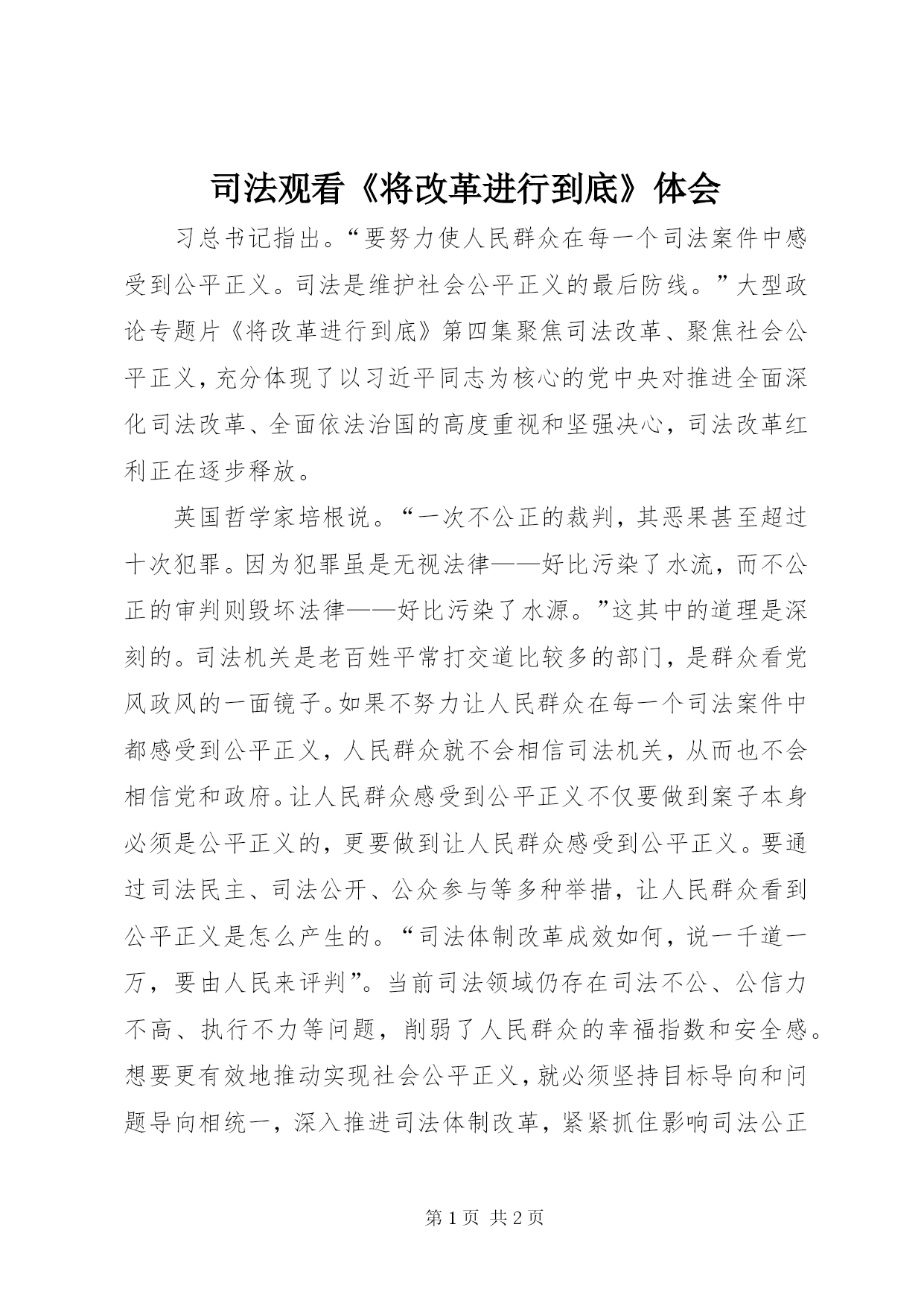第PAGE\*Arabic\*MERGEFORMAT2页共NUMPAGES\*MERGEFORMAT2页司法观看《将改革进行到底》体会习总书记指出。“要努力使人民群众在每一个司法案件中感受到公平正义。司法是维护社会公平正义的最后防线。”大型政论专题片《将改革进行到底》第四集聚焦司法改革、聚焦社会公平正义,充分体现了以习近平同志为核心的党中央对推进全面深化司法改革、全面依法治国的高度重视和坚强决心,司法改革红利正在逐步释放。英国哲学家培根说。“一次不公正的裁判,其恶果甚至超过十次犯罪。因为犯罪虽
