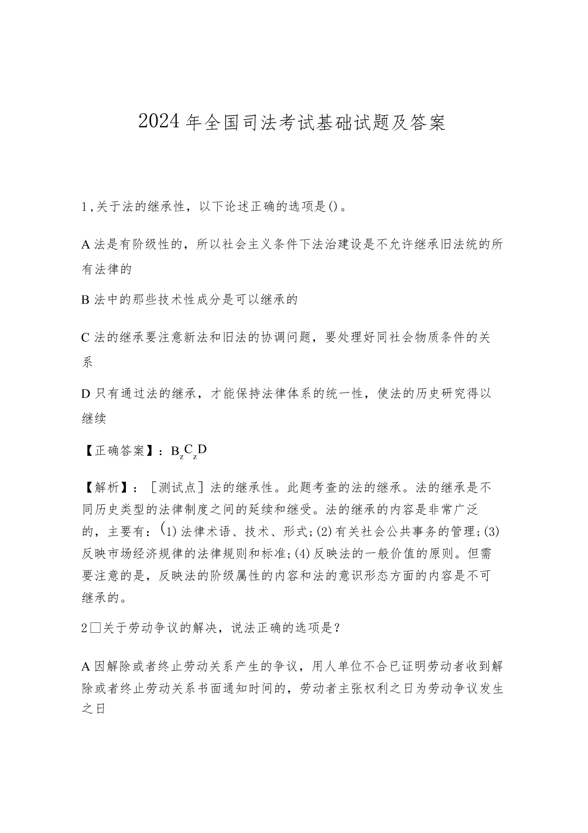 2024年全国司法考试基础试题及答案1,关于法的继承性,以下论述正确的选项是()。A法是有阶级性的,所以社会主义条件下法治建设是不允许继承旧法统的所有法律的B法中的那些技术性成分是可以继承的C法的继承要注意新法和旧法的协调问题,要处理好同社会物质条件的关系D只有通过法的继承,才能保持法律体系的统一性,使法的历史研究得以继续CD【正确答案】:Bzz【解析】:[测试点]法的继承性。此题考查的法的继承。法的继承是不同历史类型的法律制度之间的延续和继受。法的继承的内容是非常广泛的,主要有:(1)法律术语、技术、形