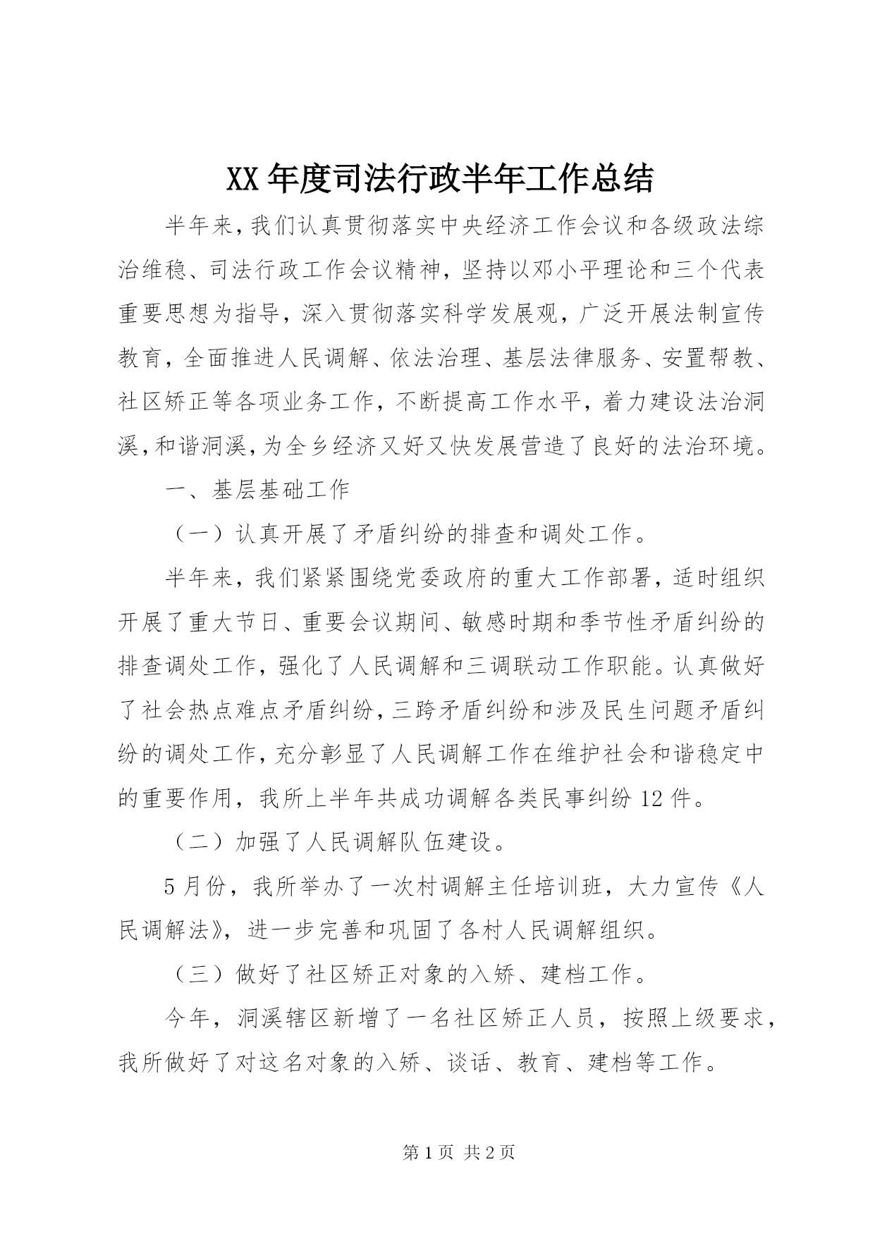 第PAGE\*Arabic\*MERGEFORMAT2页共NUMPAGES\*MERGEFORMAT2页XX年度司法行政半年工作总结半年来,我们认真贯彻落实中央经济工作会议和各级政法综治维稳、司法行政工作会议精神,坚持以邓小平理论和三个代表重要思想为指导,深入贯彻落实科学发展观,广泛开展法制宣传教育,全面推进人民调解、依法治理、基层法律服务、安置帮教、社区矫正等各项业务工作,不断提高工作水平,着力建设法治洞溪,和谐洞溪,为全乡经济又好又快发展营造了良好的法治环境。一、基层基础工作(一)认真开展